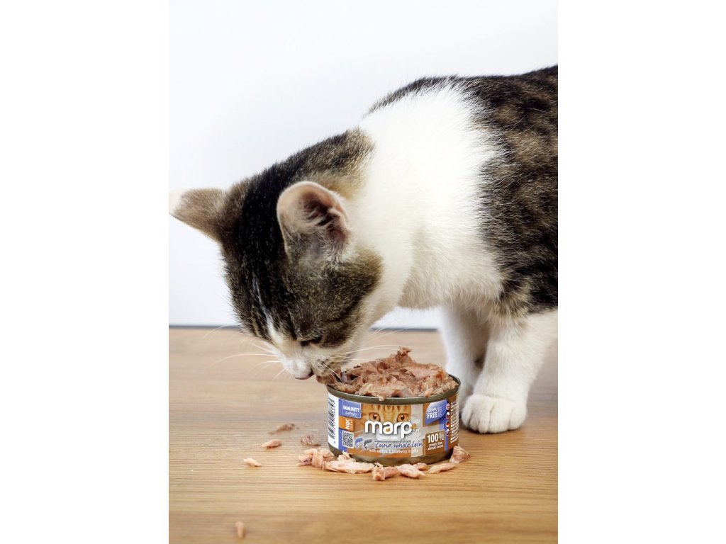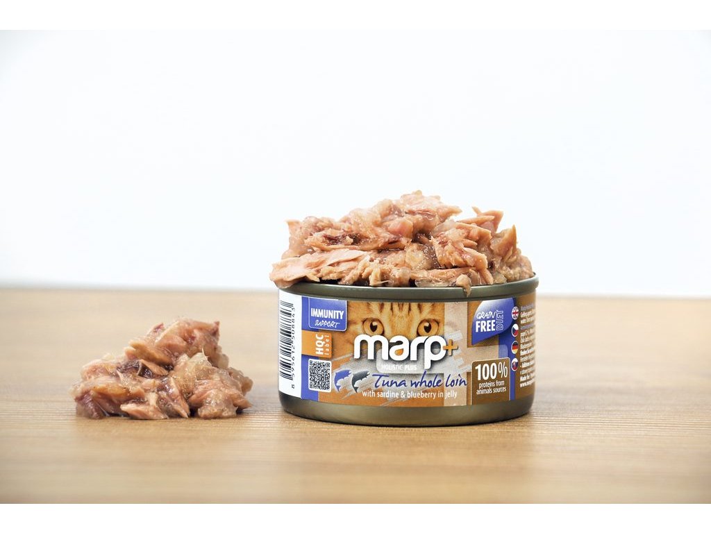 Filety z tuňáka se sardinkami v želé – žádné vnitřnosti, žádné umělé doplňkové látky, žádné obiloviny – to jsou špičkové konzervy Marp Holistic Plus pro kočky. Respektujeme kočku jako masožravce, a proto pochází 100 % bílkovin ze živočišných zdrojů. Složení jsme obohatili o borůvky na podporu imunity. Toto krmivo bude vaše kočka skutečně zbožňovat.