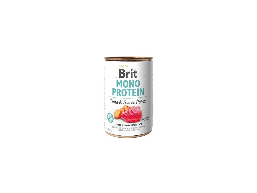 100% ČISTÝ PROTEIN Z TUŇÁKA SE SLADKÝMI BRAMBORAMI. Brit Mono Protein nabízí kompletní a vyváženou výživu. Receptura s obsahem jednoho proteinu je vhodná ke snížení rizika alergií a potravinové intolerance. Kompletní krmivo pro psy.- Vhodné pro psy s citlivým zažíváním, alergiemi a potravinovou intolerancí