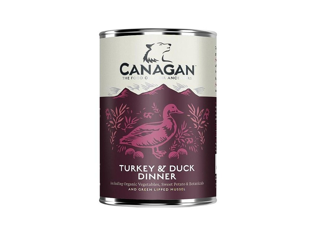 Šťavnatá masová konzerva Canagan Turkey & Duck Dinner. Večeře s krůtou a kachnou v receptuře bez obilovin - kompletní krmivo pro dospělé psy.