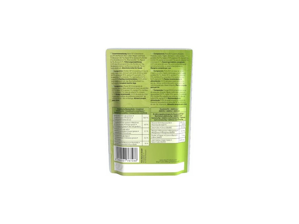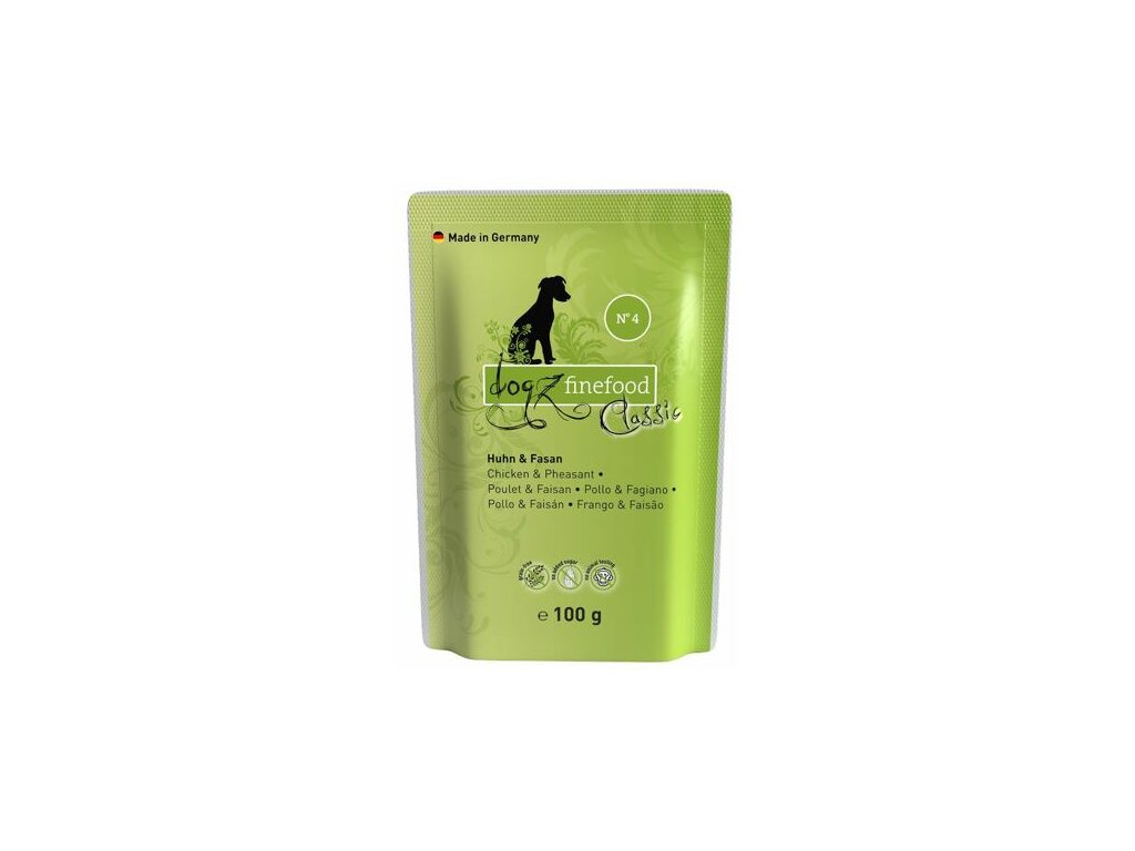 Lahodné krmivo pro psy, které obsahuje spoustu chutného kuřecího a bažantího masa, zdraví prospěšnou dýni, quinou, borůvky, řeřichu a řepkový olej. Dogz finefood obsahuje pouze suroviny vysoké potravinářské kvality a svým složením odpovídá přirozené psí stravě. Krmivo je bez konzervantů, umělých barviv a dochucovadel. Krmivo neobsahuje geneticky upravené suroviny. Jedná se o kompletní krmivo.Složení: kuřecí maso 50% (libové maso, srdce, játra, žaludky a krky), pitná voda25,7%, bažantí maso 15%, quinoa 3%, dýně 3%, borůvky 2%, minerály 1%, řepkový olej 0,2%, řeřicha 0,1%.