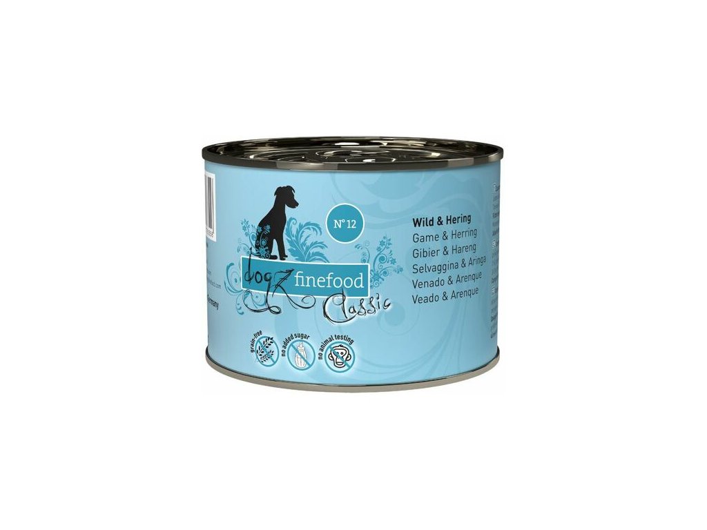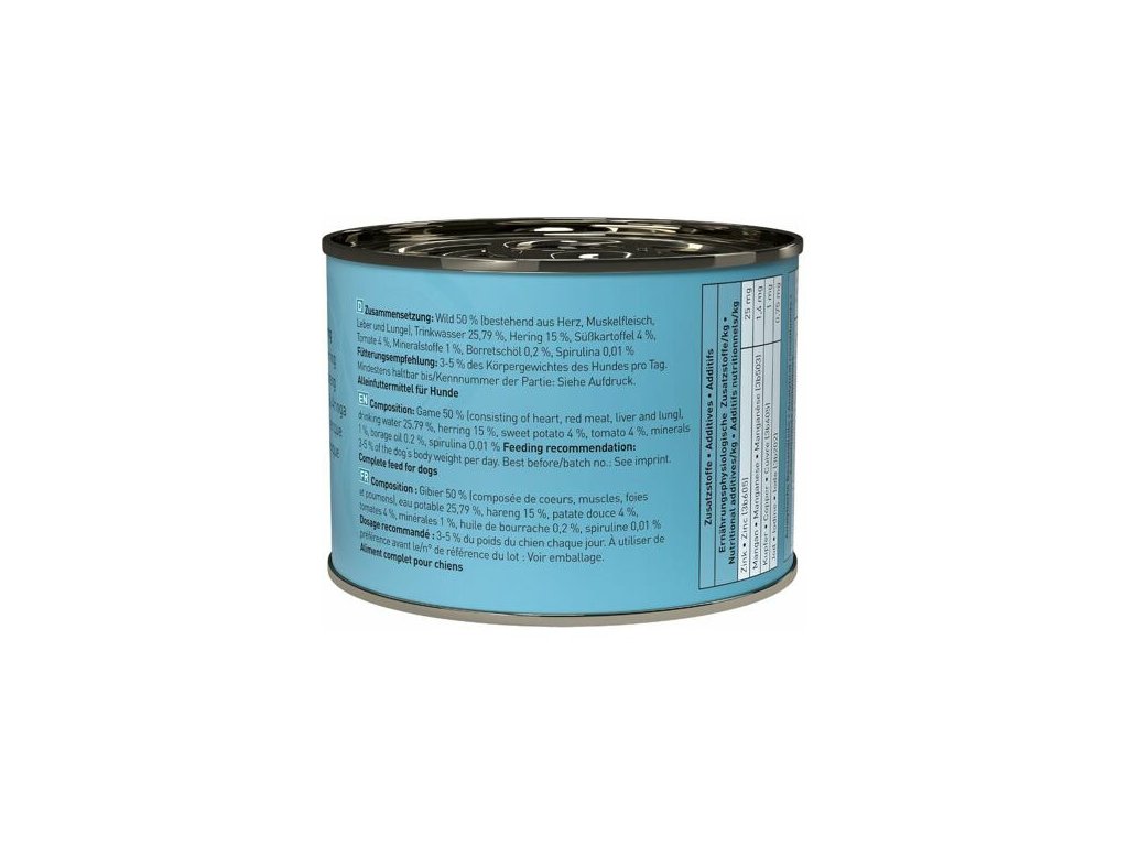 Lahodné krmivo pro psy, které obsahuje vysoký podíl zvěřiny a sledího masa, batáty, rajčata a zdraví prospěšnou spirulinu. Dogz finefood obsahuje pouze suroviny vysoké potravinářské kvality a svým složením odpovídá přirozené psí stravě. Krmivo je bez konzervantů, umělých barviv a dochucovadel. Krmivo neobsahuje geneticky upravené suroviny. Jedná se o kompletní krmivo.Složení: zvěřina 50% (srdce, svalovina, játra a plíce), pitná voda 25,79%, sledí maso 15%, batáty 4%, rajčata 4%, minerály 1%, brutnákový olej 0,2% a spirulina 0,01%.