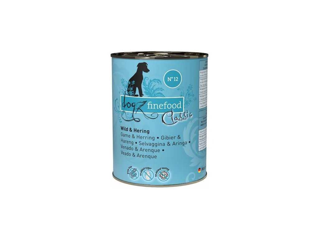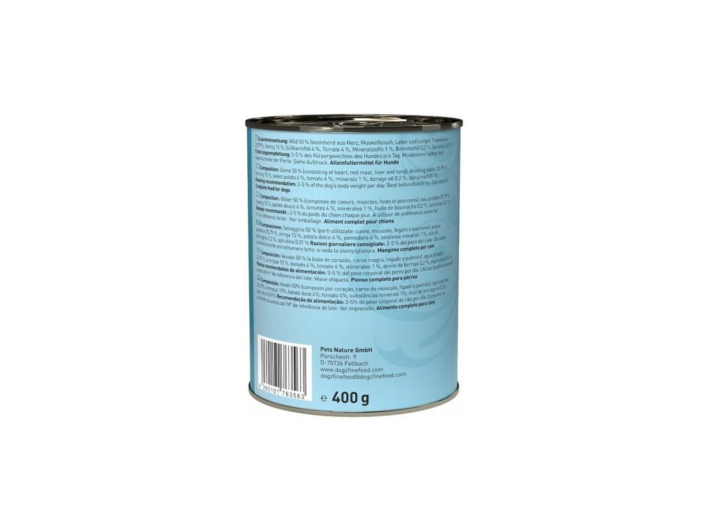 Lahodné krmivo pro psy, které obsahuje vysoký podíl zvěřiny a sledího masa, batáty, rajčata a zdraví prospěšnou spirulinu. Dogz finefood obsahuje pouze suroviny vysoké potravinářské kvality a svým složením odpovídá přirozené psí stravě. Krmivo je bez konzervantů, umělých barviv a dochucovadel. Krmivo neobsahuje geneticky upravené suroviny. Jedná se o kompletní krmivo.Složení: zvěřina 50% (srdce, svalovina, játra a plíce), pitná voda 25,79%, sledí maso 15%, batáty 4%, rajčata 4%, minerály 1%, brutnákový olej 0,2% a spirulina 0,01%.