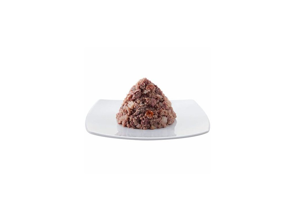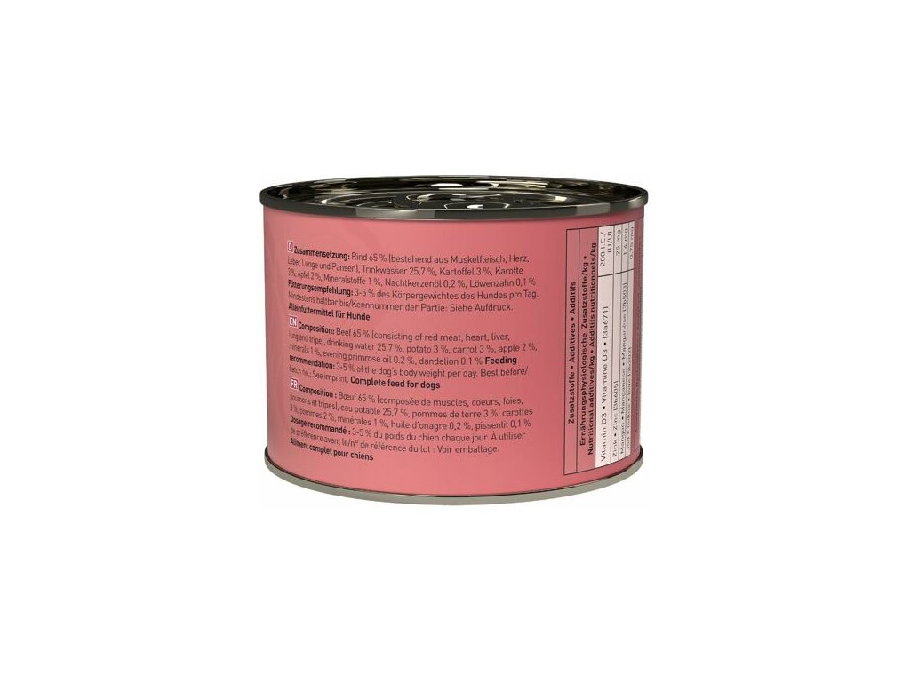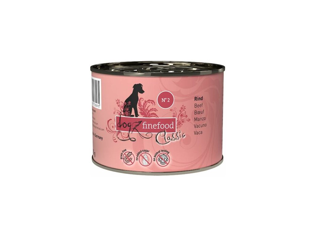Lahodné krmivo pro psy, které obsahuje vysoký podíl chutného hovězího masa, zdraví prospěšnou mrkev, brambory, jablka a smetánku lékařskou. Dogz finefood obsahuje pouze suroviny vysoké potravinářské kvality a svým složením odpovídá přirozené psí stravě. Krmivo je bez konzervantů, umělých barviv a dochucovadel. Krmivo neobsahuje geneticky upravené suroviny. Jedná se o kompletní krmivo.Složení: hovězí maso 65% (libové maso, srdce, játra, plíce a dršťky), pitná voda 25,7%, brambory 3%, mrkev 3%, jablka 2%, minerály 1%, pupalkový olej 0,2% a smetánka lékařská 0,1%.