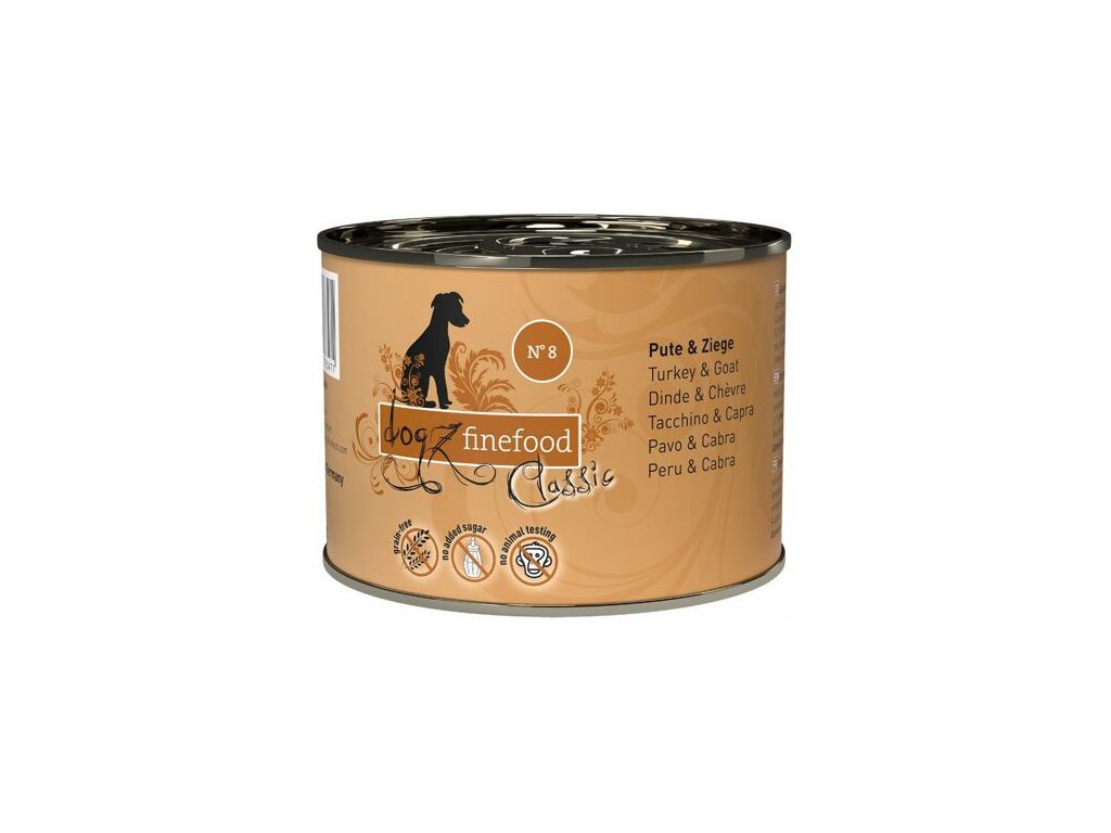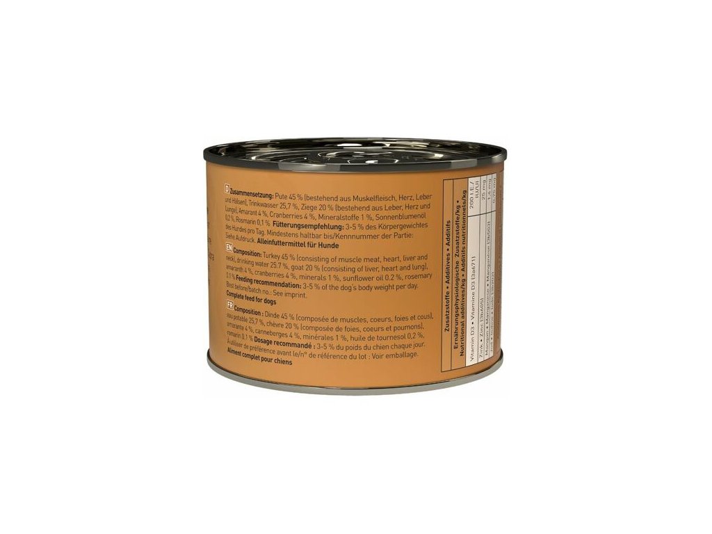 Lahodné krmivo pro psy, které obsahuje spoustu jemného krůtího a chutného kozího masa, zdravý laskavec (amarant), rozmarýn lékařský a brusinky. Dogz finefood obsahuje pouze suroviny vysoké potravinářské kvality a svým složením odpovídá přirozené psí stravě. Krmivo je bez konzervantů, umělých barviv a dochucovadel. Krmivo neobsahuje geneticky upravené suroviny. Jedná se o kompletní krmivo.Složení: krůtí maso 45% (svalovina, srdce, játra a krky), pitná voda 25,7%, kozí maso 20% (játra, srdce a plíce), laskavec (amarant) 4%, brusinky 4%, minerály 1%, slunečnicový olej 0,2%, rozmarýn 0,1%.