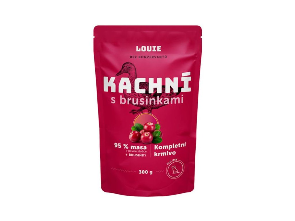 kachní maso, vývar, změkčené kachní kosti, brusinky, minerály a vitamíny.