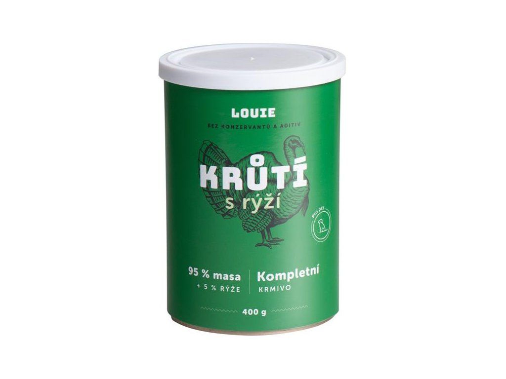 Masová konzerva pro psy Louie s obsahem 95% jemně namletého masa a s 5% rýže bez přidané želatiny, konzervantů, dochucovadel, barviv či stabilizátorů.