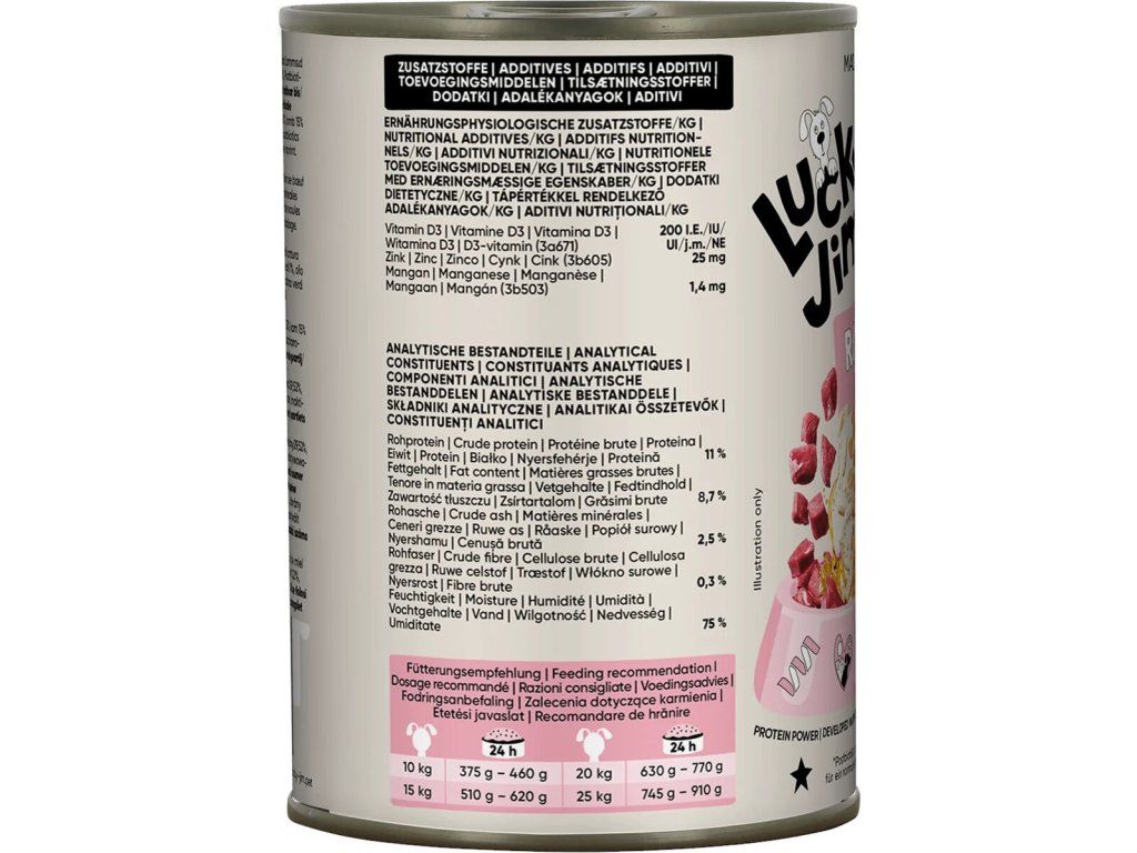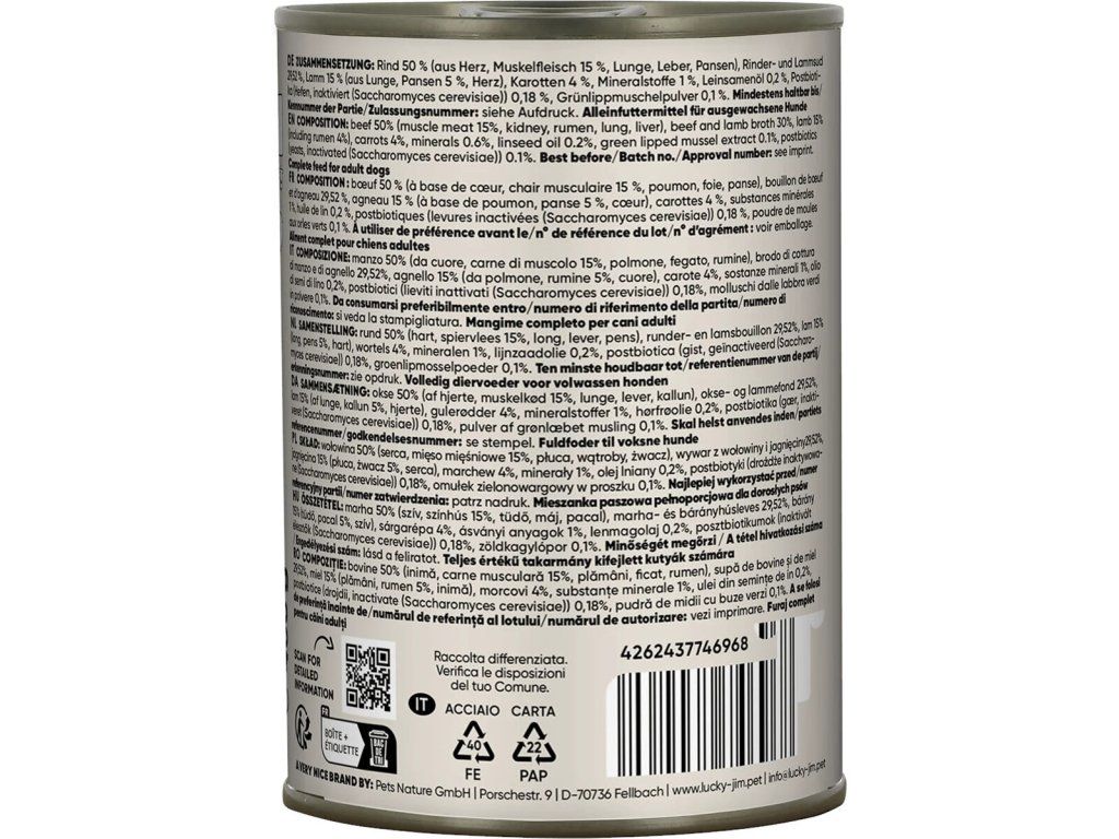 Kompletní bezobilné mokré krmivo pro dospělé psy, vhodné pro každodenní krmení.Krmivo je velmi dobře stravitelné a hodí se i pro psy s citlivým trávením. Obsahuje vysoký podíl hovězího a jehněčího masa, vnitřností a vývaru, které jsou přirozeným zdrojem kvalitních živočišných bílkovin. Součástí je i mrkev jako zdroj vlákniny a postbiotika, – látky z prospěšných mikroorganismů (v tomto případě inaktivované kvasinky Saccharomyces), které přispívají k bezproblémovému trávení, podporují funkci imunitního systému a podílejí se na celkové vitalitě psa.