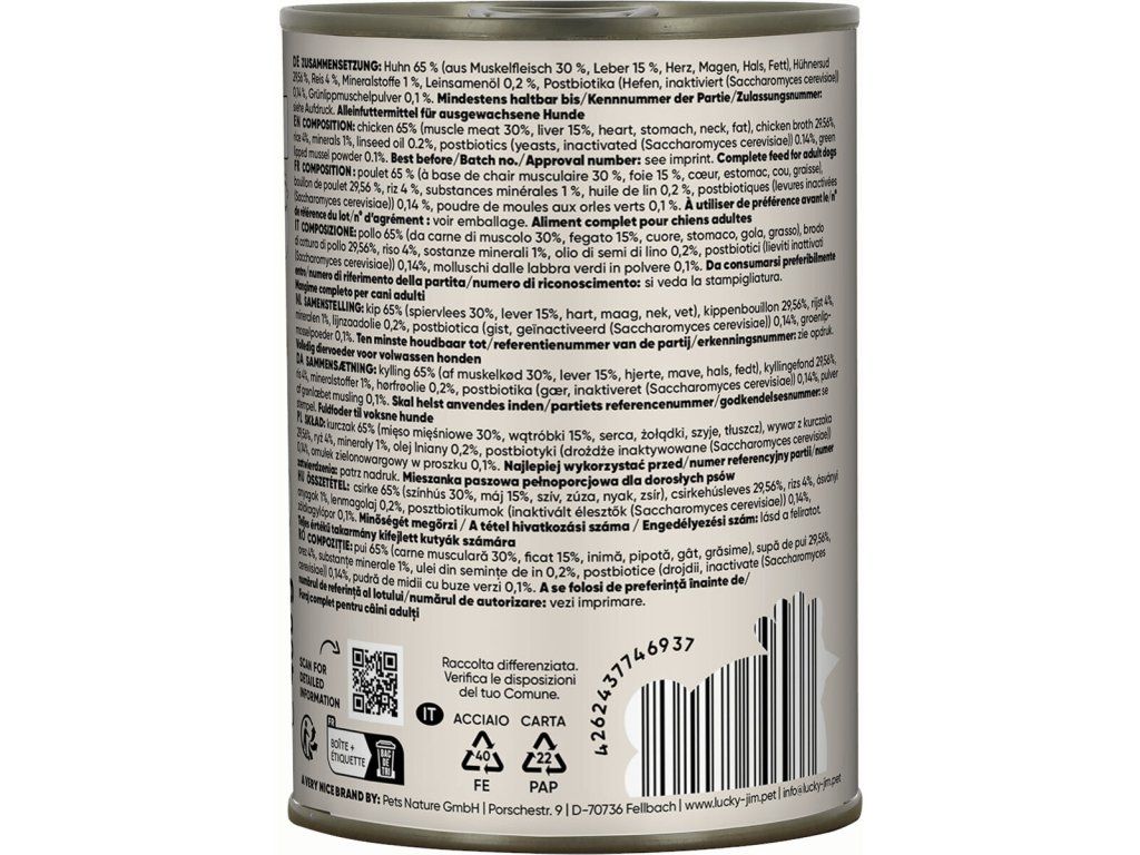 Kompletní mokré krmivo pro dospělé psy obsahuje vysoký podíl kuřecího masa, vnitřnosti, vývar, játra a funkční suroviny podporující zažívání a celkovou vitalitu psa.Receptura je doplněna o postbiotika – látky vznikající přirozenou činností prospěšných bakterií, v tomto případě inaktivované kvasinky Saccharomyces, které přispívají k bezproblémovému trávení, podporují funkci imunitního systému a podílejí se na celkové vitalitě psa.