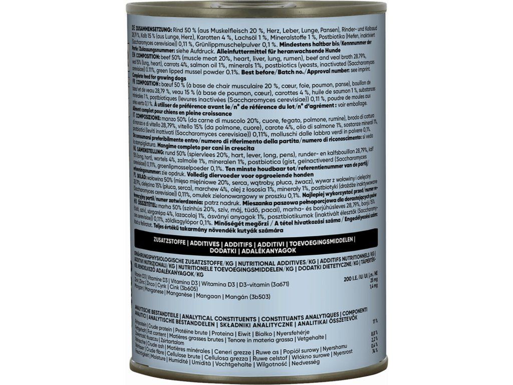 Kompletní bezobilné mokré krmivo vhodné pro štěňata a mladé psy v období růstu. Bezobilná receptura obsahuje vysoký podíl mletého hovězího a telecího masa, vnitřností a vývaru, a je obohacena o postbiotika – látky vznikající přirozenou činností prospěšných bakterií, v tomto případě inaktivované kvasinky Saccharomyces, které přispívají k bezproblémovému trávení, podporují funkci imunitního systému a podílejí se na celkové vitalitě psa.Součástí je i mrkev, lososový olej jako zdroj omega-3 mastných kyselin, a prášek ze slávky zelenoústé – druh mušle z Nového Zélandu, která přirozeně obsahuje omega-3 mastné kyseliny, glykosaminoglykany a minerální látky, a tradičně se používá na podporu kloubů.