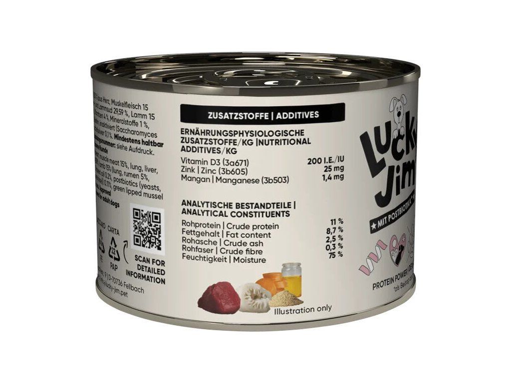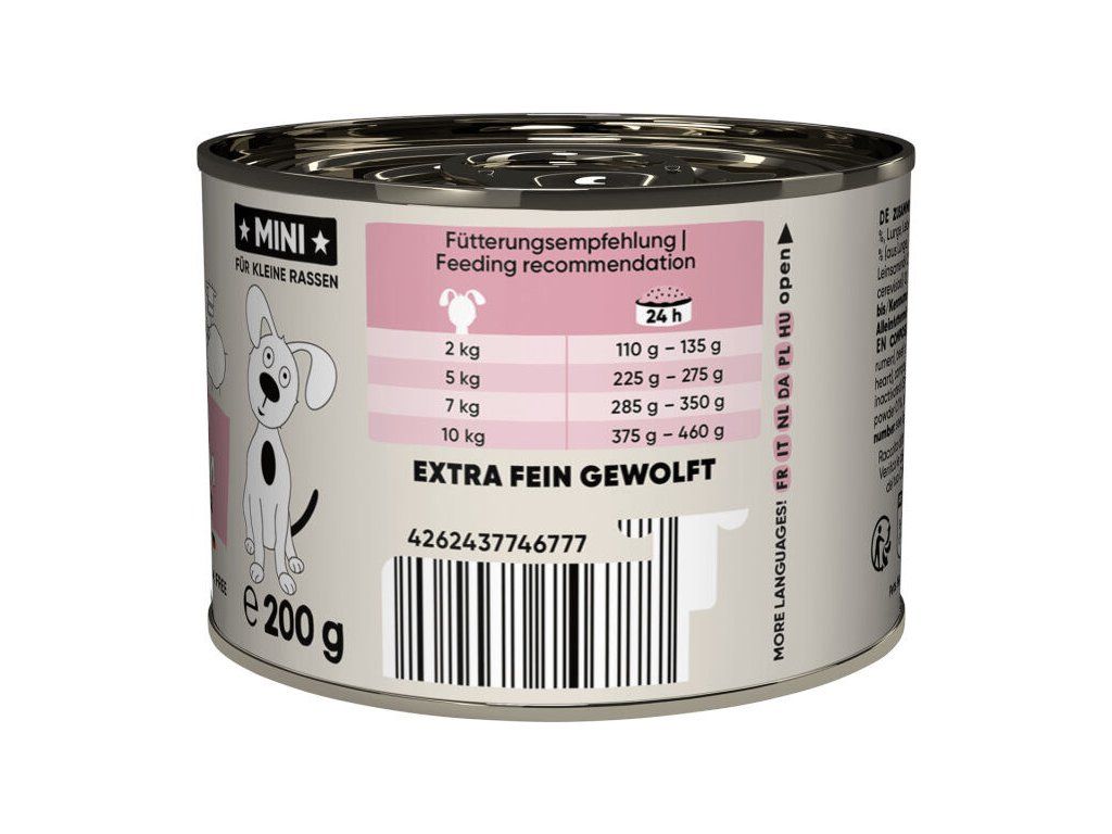 Kompletní bezobilné mokré krmivo pro dospělé psy, vhodné pro každodenní krmení. Maso je extra jemně mleté, takže se obzvláště hodí pro pejsky malých plemen. 200 gramová konzerva je praktická volba vzhledem k menším porcím typickým pro malé psy.Krmivo je velmi dobře stravitelné a hodí se i pro psy s citlivým trávením. Obsahuje vysoký podíl hovězího a jehněčího masa, vnitřností a vývaru. Součástí krmiva je i mrkev a lněný olej jako zdroj rostlinných omega-3 mastných kyselin – konkrétně kyseliny alfa-linolenové, která má prokazatelný vliv na udržení normální hladiny cholesterolu v krvi.