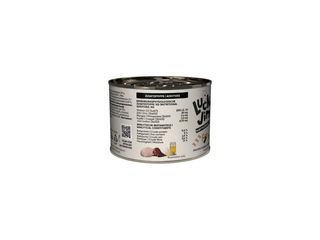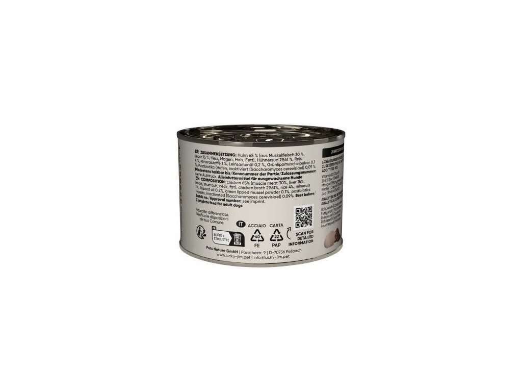 Složení: kuře 65 % (z toho svalovina 30 %, játra 15 %, srdce, žaludek, krk, tuk), kuřecí vývar 29,56 %, játra 6 %, rýže 4 %, lněný olej 0,2 %, minerální látky 1 %, prášek ze slávky zelenoústé 0,1 %, postbiotika (inaktivované kvasinky Saccharomyces cerevisiae) 0,09 %