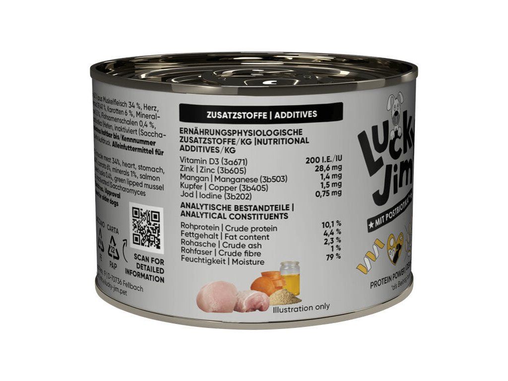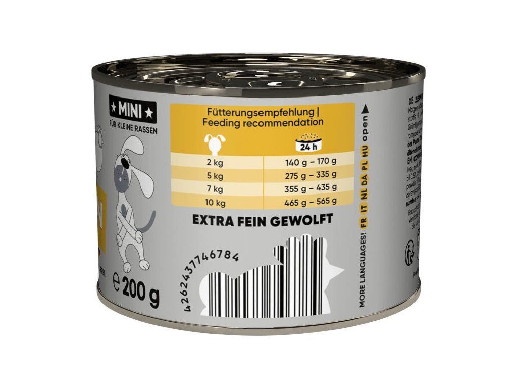 Extra jemná struktura usnadňuje příjem krmiva i těm nejmenším pejskům. 200 gramová konzerva odpovídá potřebám malých psů a jejich menším porcím a díky menšímu obsahu nezůstává po otevření dlouho skladovaná.