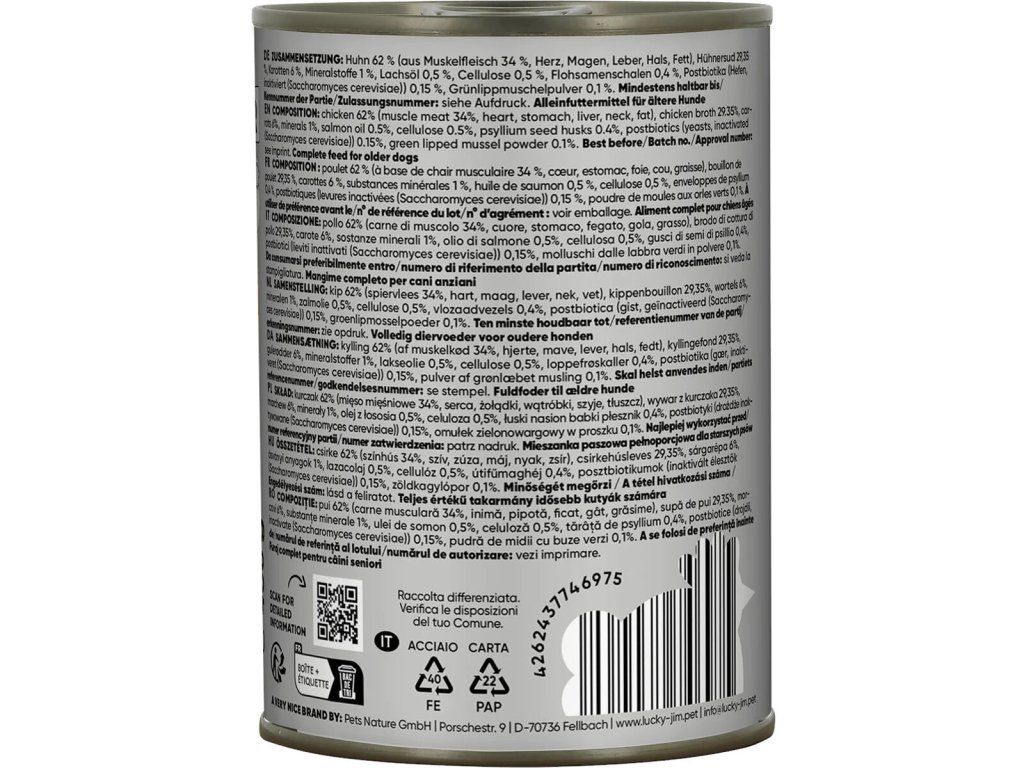 Kompletní krmivo přizpůsobené potřebám psích seniorů, s vysokým podílem kuřecího masa, vnitřnostmi, vývarem a funkčními ingrediencemi, které přispívají k udržení dobré kondice a vitality.Obsahuje postbiotika – látky vznikající přirozenou činností prospěšných bakterií, v tomto případě inaktivované kvasinky Saccharomyces, které přispívají k bezproblémovému trávení, podporují funkci imunitního systému a podílejí se na celkové vitalitě psa.