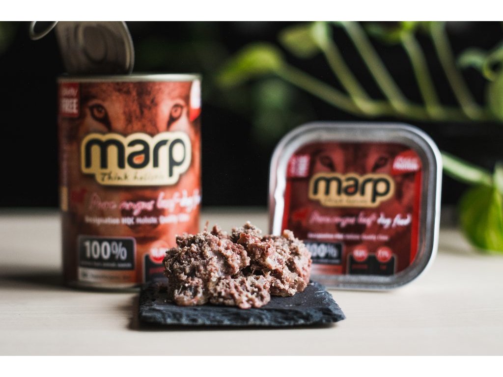 Konzervy Marp Pure obsahují 100% bílkovin ze živočišných zdrojů. Obsahují pouze maso, vnitřnosti, vývar a minerály. Nepoužíváme žádné umělé konzervanty, barviva, plnidla apod a jsou vždy bez jakýchkoliv obilovin. Konzerva Marp s hovězím bez obilovin je vhodná pro psy s citlivým zažíváním a dle našich zkušeností je velmi vhodná i pro psy s potravními alergiemi.