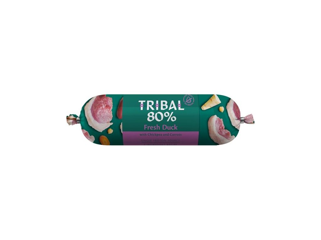 Toto kompletní mokré bezobilné monoproteinové krmivo pro psy obsahuje 80 % živočišných bílkovin. Receptura sestává z pouhých 3 ingrediencí: 80 % masa z jednoho zdroje + cizrna + mrkev. Díky jednoduchému složení jsou salámy Tribal 80 % vhodné i pro nejcitlivější a nejvybíravější psy a jsou ideálním doplňkem ke krmivům Tribal Fresh Pressed.
