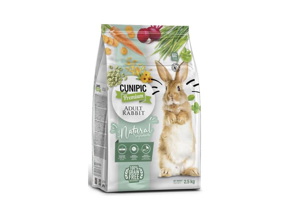 Nutričně kompletní a vyvážená grain-free směs pro dospělé králíky (od 6 měsíců věku) všech druhů pomáhá svým specifickým složením udržet zvíře zdravé a ve skvělé kondici. Kvalitní přírodní suroviny dodávají krmivu vynikající chutnost i bez použití umělých přísad. Bezobilné složení výrazně omezuje vznik případných alergických reakcí a nízký obsah tuků přispívá k prevenci obezity. Krmivo je bohatým zdrojem omega-3 a esenciálních mastných kyselin, které prospívají zdraví kůže a srsti, a vláknin podporujících trávení a obrušování zubů. Pomáhá také udržet silné kosti a svaly a zabránit tvorbě ledvinových kamenů. Přidané vitamíny a minerály podporují zdravý metabolismus a posilují imunitu. Produkt je balen v ochranné atmosféře, která zajišťuje jeho dlouhodobou čerstvost a uchování živin.