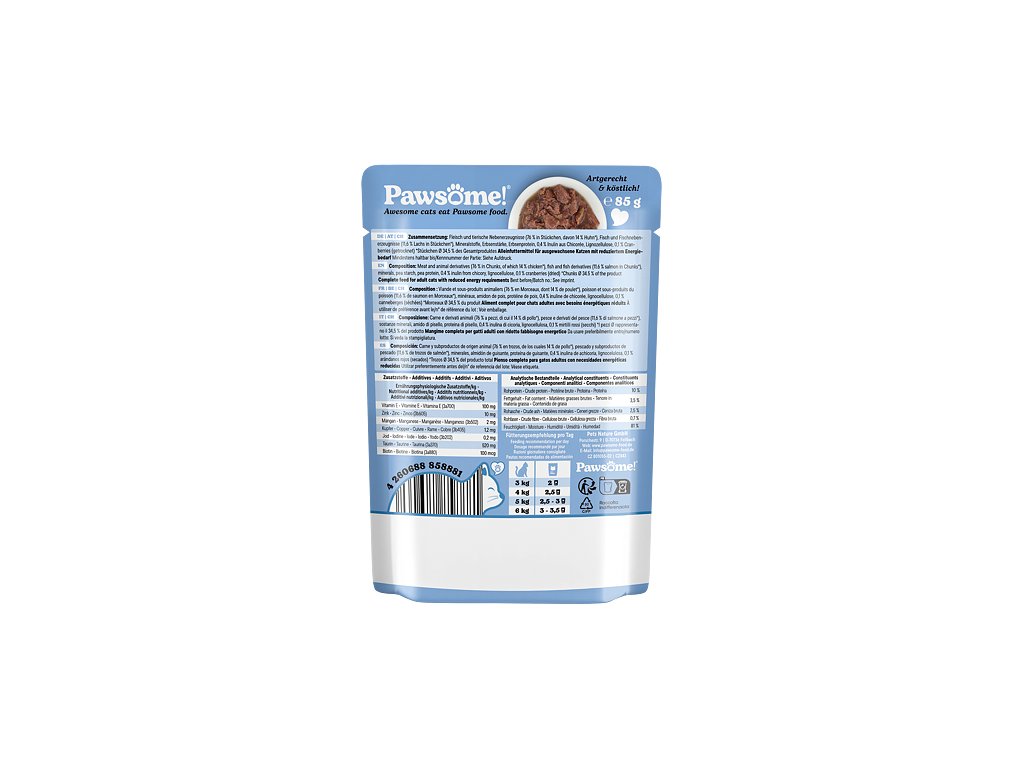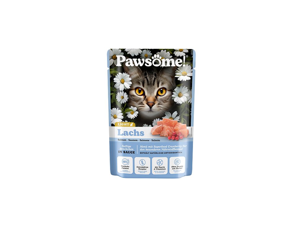 Šťavnaté kousky s lososem v lahodné omáčce jsou kompletním krmivem se sníženým obsahem kalorií, vyváženým podílem bílkovin, tuků, vitamínů a minerálů, které přispívají ke spokojenému životu dospělých koček. Je obzvláště vhodné pro kočky s nižšími energetickými nároky, kastrované kočky.Krmivo Pawsome! je vytvořeno tak, aby splňovalo očekávání i těch nejmlsnějších mazlíčků a zároveň zajišťovalo jejich zdraví, vitalitu a celkovou spokojenost. Jeho delikátní chuť, vůně a kombinace kousků masa a omáčky nabízí kočkám jedinečný chuťový zážitek a zároveň jim dodává živiny, nezbytné pro jejich každodenní dobrodružství.