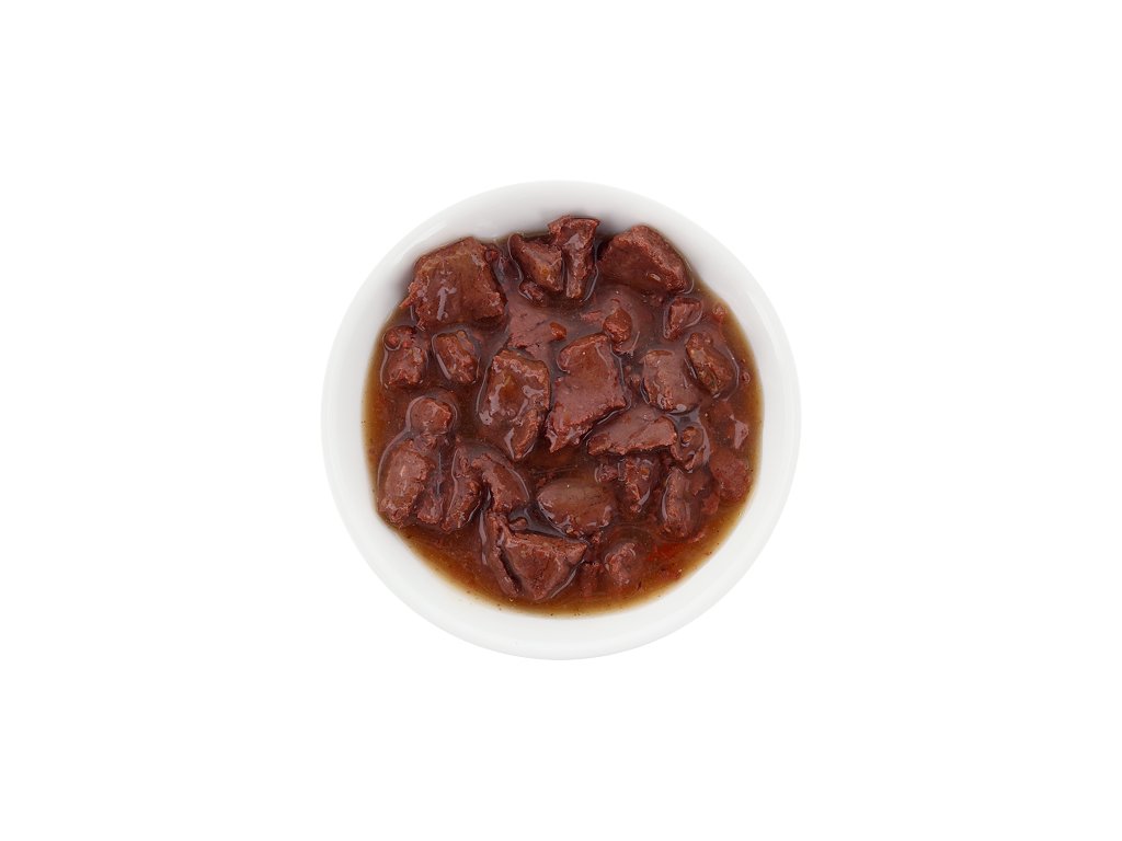 Složení: maso a vedlejší výrobky živočišného původu (kousky masa 88 %, z toho hovězí maso 40,6 %), minerální látky, hrachový škrob, hrachová bílkovina, rajčata 0,45 % (sušená), inulin z čekanky 0,4 %, lignocelulóza, rozmarýn 0,025 %