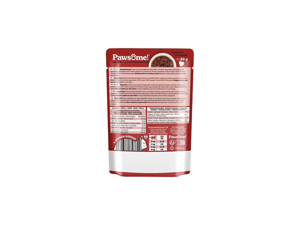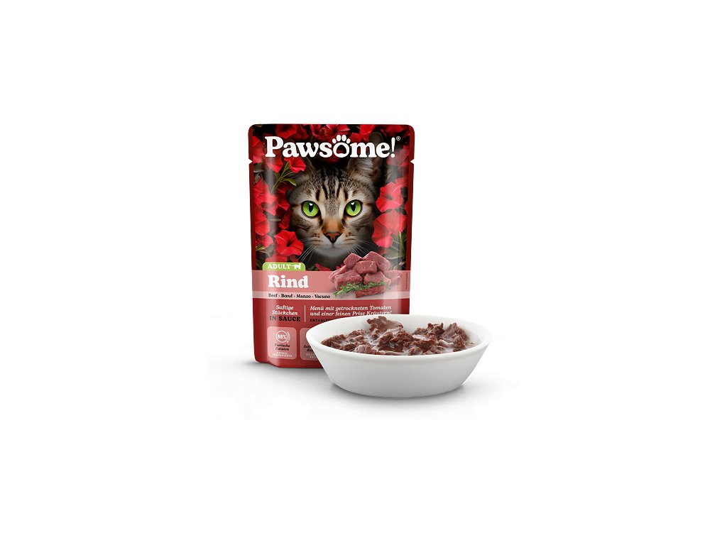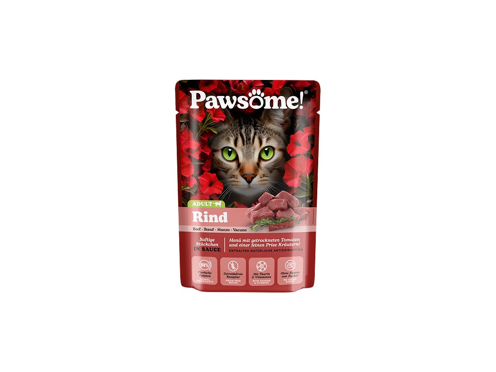 Šťavnaté kousky s hovězím, rajčaty a rozmarýnem v lahodné omáčce jsou kompletním krmivem s vyváženým podílem bílkovin, tuků, vitamínů a minerálů, které přispívají ke spokojenému a aktivnímu životu dospělých koček všech plemen a velikostí.Krmivo Pawsome! je vytvořeno tak, aby splňovalo očekávání i těch nejmlsnějších mazlíčků a zároveň zajišťovalo jejich zdraví, vitalitu a celkovou spokojenost.