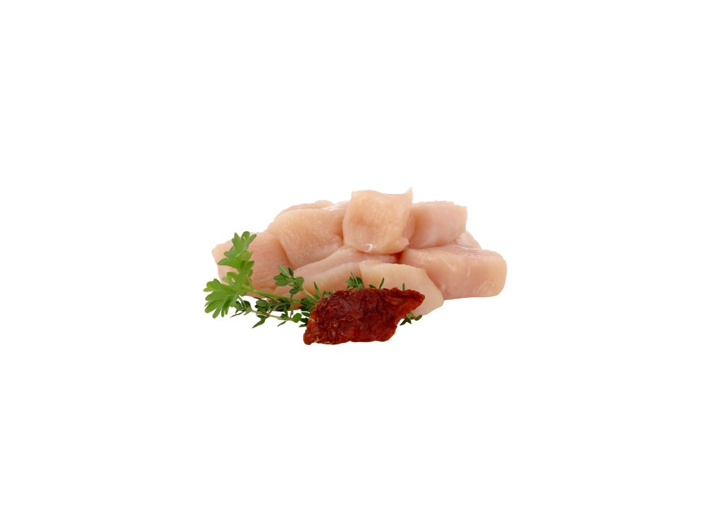 Složení: maso a vedlejší výrobky živočišného původu (kousky masa 88 %, z toho kuřecí maso 40,6 %), minerální látky, hrachový škrob, hrachová bílkovina, rajčata 0,45 % (sušená), inulin z čekanky 0,4 %, lignocelulóza, tymián 0,025 %, petržel 0,025 %