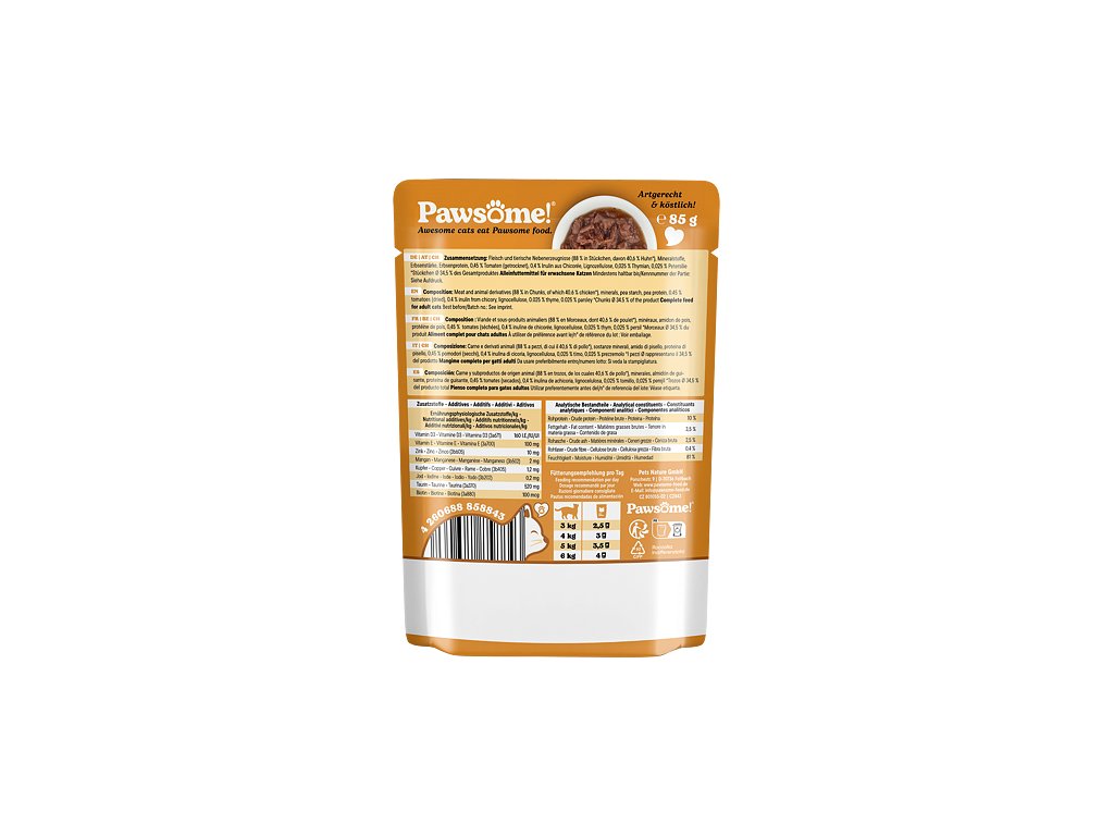 Šťavnaté kousky s kuřecím masem v lahodné omáčce jsou kompletním krmivem s vyváženým podílem bílkovin, tuků, vitamínů a minerálů, které přispívají ke spokojenému a aktivnímu životu dospělých koček všech plemen a velikostí.Krmivo Pawsome! je vytvořeno tak, aby splňovalo očekávání i těch nejmlsnějších mazlíčků a zároveň zajišťovalo jejich zdraví, vitalitu a celkovou spokojenost.