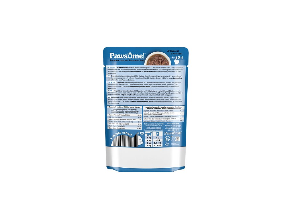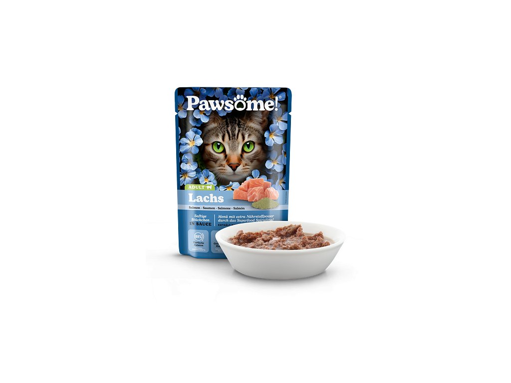 Šťavnaté kousky z lososa a kuřecího masa se spirulinou v lahodné omáčce jsou kompletním krmivem s vyváženým podílem bílkovin, tuků, vitamínů a minerálů, které přispívají ke spokojenému a aktivnímu životu dospělých koček všech plemen a velikostí.Krmivo Pawsome! je vytvořeno tak, aby splňovalo očekávání i těch nejmlsnějších mazlíčků a zároveň zajišťovalo jejich zdraví, vitalitu a celkovou spokojenost.