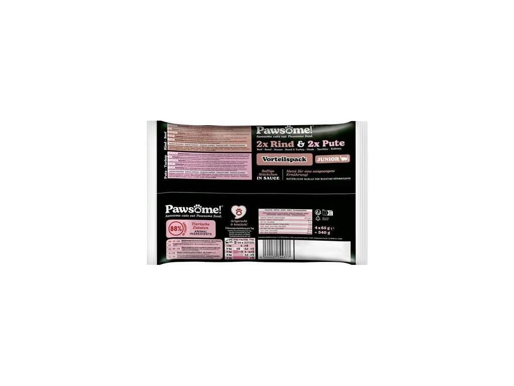 Složení Pawsome! Junior s krůtím masem: maso a vedlejší výrobky živočišného původu (kousky masa 88 %, z toho krůtí maso 40,6 %), minerální látky, lososový olej 1 %, hrachový škrob, hrachová bílkovina, čekankový inulin 0,4 %, lignocelulóza, sušené brusinky 0,1 %