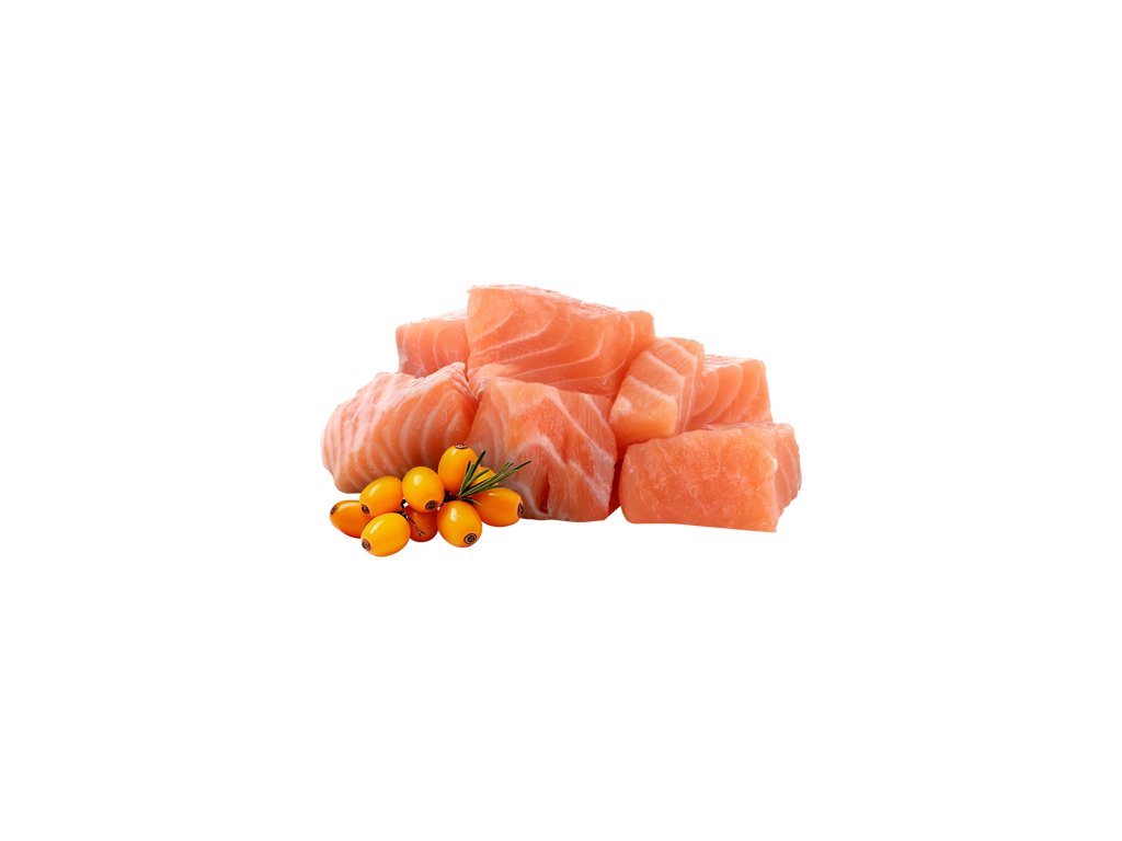 Složení: maso a vedlejší výrobky živočišného původu (kousky masa 73,5 %, z toho kuřecí maso 14 %), ryby a vedlejší výrobky z ryb (kousky lososa 14,5 %), minerální látky, lněný olej 1 %, hrachový škrob, hrachová bílkovina, inulin z čekanky 0,4 %, lignocelulóza, rakytník 0,1 %