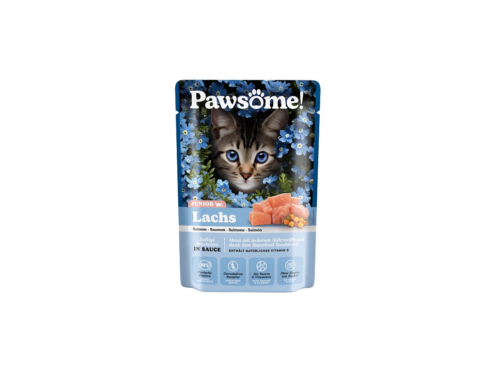 Šťavnaté měkké kousky s lososem a rakytníkem v lahodné omáčce jsou kompletním krmivem s vyváženým podílem bílkovin, tuků, vitamínů a minerálů, které přispívají ke zdravému vývoji a růstu mladých koček do 12 měsíců věku.Krmivo Pawsome! je vytvořeno tak, aby splňovalo očekávání i těch nejmlsnějších mazlíčků a zároveň zajišťovalo jejich zdraví, vitalitu a celkovou spokojenost.