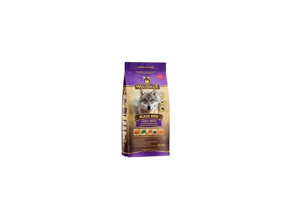 Vlci loví svou kořist od Skalistých hor Severní Ameriky, arktické tundry, hor a lesů Evropy až po pouště a stepi střední Asie. To jim dodává maso a vnitřnosti bohaté na živiny, ale také zeleninu, ovoce, bobule, kořeny a bylinky z obsahu žaludku kořisti. Obilí zde není zahrnuto. Vlk tak přijímá potřebné vitamíny, minerály, stopové prvky, enzymy a druhotné rostlinné látky. Vzhledem k tomu, že vlk je předkem všech psů, naše suché krmivo pro psy Wolfsblut je založeno na přirozených stravovacích návycích vlka. Obsahuje hodně masa nebo ryb v kombinaci se superpotravinami, které obsahují hodnotné ingredience – stejně jako v přírodě, bez obilovin. Náš výběr výjimečných druhů masa a superpotravin bohatých na živiny vychází z vlčích biotopů a jejich pestré stravy. Wolfsblut nabízí každému psovi druhově vhodnou a originální stravu a díky rozmanitosti odrůd si každý najde něco, co snese. Receptura suchého krmiva BLACK BIRD LARGE BREED kombinuje výživu vlků s nejnovějšími vědeckými poznatky o správné výživě psů.