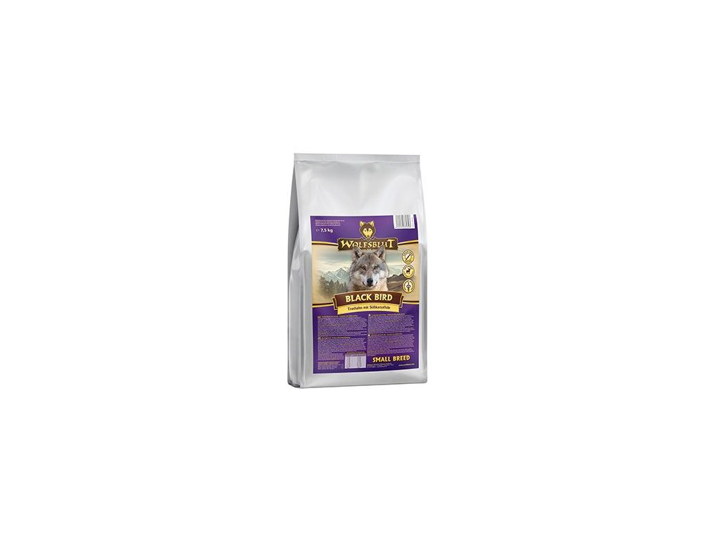 Vlci loví svou kořist od Skalistých hor Severní Ameriky, arktické tundry, hor a lesů Evropy až po pouště a stepi střední Asie. To jim dodává maso a vnitřnosti bohaté na živiny, ale také zeleninu, ovoce, bobule, kořeny a bylinky z obsahu žaludku kořisti. Obilí zde není zahrnuto. Vlk tak přijímá potřebné vitamíny, minerály, stopové prvky, enzymy a druhotné rostlinné látky. Vzhledem k tomu, že vlk je předkem všech psů, naše suché krmivo pro psy Wolfsblut je založeno na přirozených stravovacích návycích vlka. Obsahuje hodně masa nebo ryb v kombinaci se superpotravinami, které obsahují hodnotné ingredience – stejně jako v přírodě, bez obilovin. Náš výběr výjimečných druhů masa a superpotravin bohatých na živiny vychází z vlčích biotopů a jejich pestré stravy. Wolfsblut nabízí každému psovi druhově vhodnou a originální stravu a díky rozmanitosti odrůd si každý najde něco, co snese. Receptura suchého krmiva BLACK BIRD SMALL BREED kombinuje výživu vlků s nejnovějšími vědeckými poznatky o správné výživě psů.