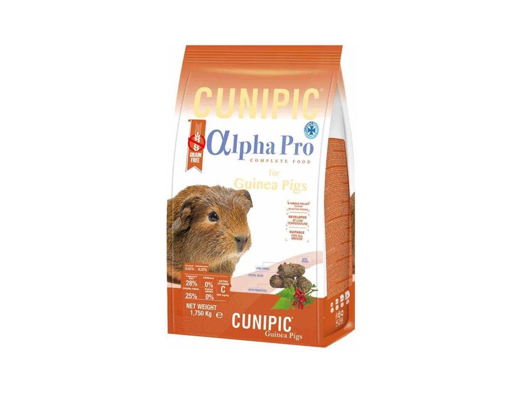 Cunipic Alpha Pro Guinea Pig – morče. Kompletní krmivo bez obsahu obilovin. Zdravá, velice chutná a vyvážená receptura pro morčata. Každá granule obsahuje všechny nezbytné suroviny a vitamíny pro zdraví morčete bez výkyvů v příjmu živin. Krmivo s vysokým obsahem vlákniny (25 %), bez přidaných barviv a cukrů vhodné pro všechna plemena.