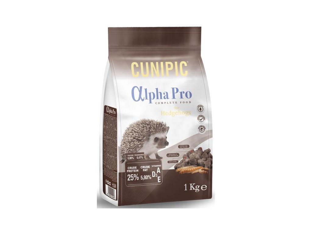 Cunipic Alpha Pro Hedgehog je jedinečné, nutričně kompletní a vyvážené krmivo pro ježky. Jehož hlavní složkou je hmyz (mouční červi), pro ježky velmi výživný a chuťově přitažlivý zdroj bílkovin. Každá granule je doslova nabitá energií a obsahuje všechny nezbytné živiny, které ježek potřebuje k zdravému a spokojenému životu. Zároveň jde o nízkotučnou recepturu, která pomáhá předcházet rozvoji obezity, k němuž mají ježci sklon.