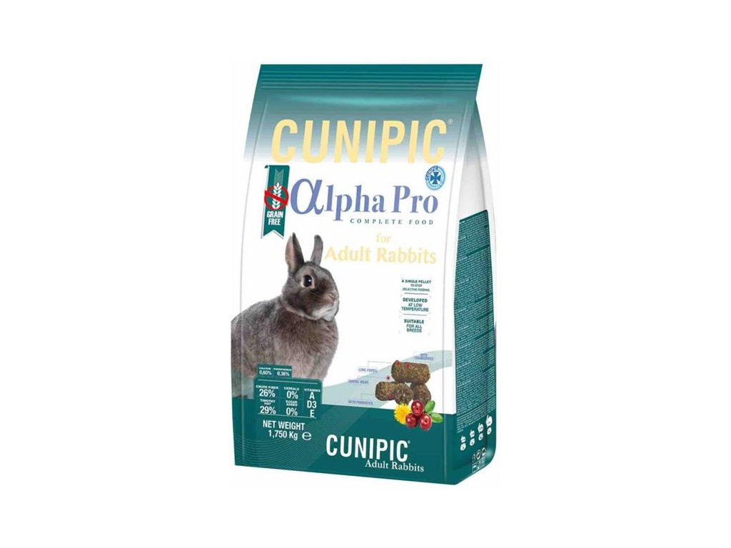 Cunipic AlphaPro Adult Rabbits - dospělý králík - kompletní krmivo bez obsahu obilovin. Zdravá, velice chutná a vyvážená receptura pro dospělé králíky (od 6 měsíců věku). Každá granule obsahuje všechny nezbytné suroviny a vitamíny pro zdraví králíka bez výkyvů v příjmu živin. Krmivo s vysokým obsahem vlákniny (26 %), bez přidaných barviv a cukru vhodné pro všechna plemena.
