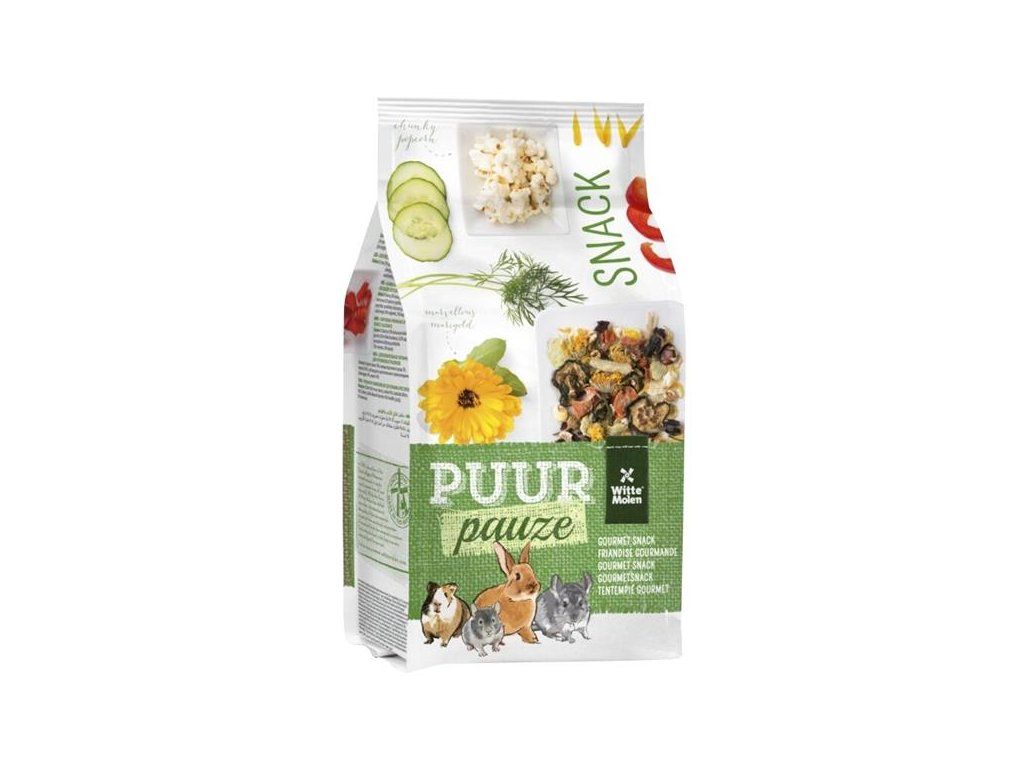 PUUR pauze snack muesli je lahůdková pochoutková doplňková směs se zeleninou a bylinkami pro chutné mlsání králíků, morčat, činčil, osmáků a dalších drobných savců.