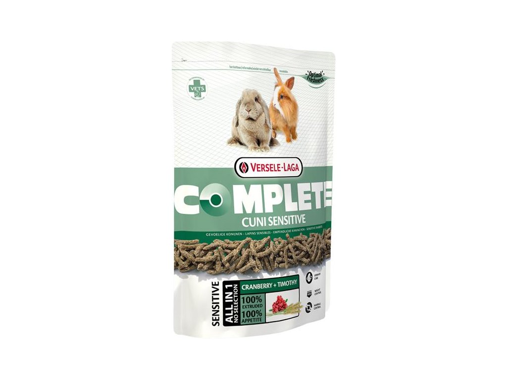 Kompletní krmivo pro zakrslé králíky. Cuni Sensitive Complete je 100% extrudované jednosložkové krmivo se sníženým obsahem energie, určené pro citlivé, méně aktivní nebo starší králíky. Je obohaceno o prebiotika, antioxidanty a brusinky. Usnadňuje tak trávení a podporuje správnou funkci močového ústrojí. Obsahuje vlákninu z celých neporušených kousků bojínkového sena. Bohatě doplněno o různé druhy trav a bylin. Neobsahuje obiloviny.