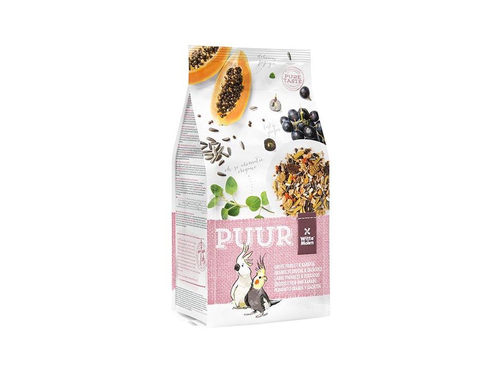 Receptura PUUR Large Parakeet & Cockatoo – střední papoušci obsahuje vše, co střední papoušci (korely, rozely,…) a kakaduové potřebují pro plnohodnotný život. Vyvážené složení s přidanými vitamíny a stopovými prvky pro zvýšení vitality ptáků. Přidané bílkoviny (vejce) napomáhají skvělé kondici opeření a odchovu mláďat. Lněné semínko pro lesklé peří a snadné přepeřování. Přidaná prebiotika se podílejí na zdravém trávení. Navíc drcené lastury ústřic podporují zdravé trávení a jsou výborným zdrojem vápníku. Krmivo bez umělých barviv a umělých aromat – chutí a vůní.