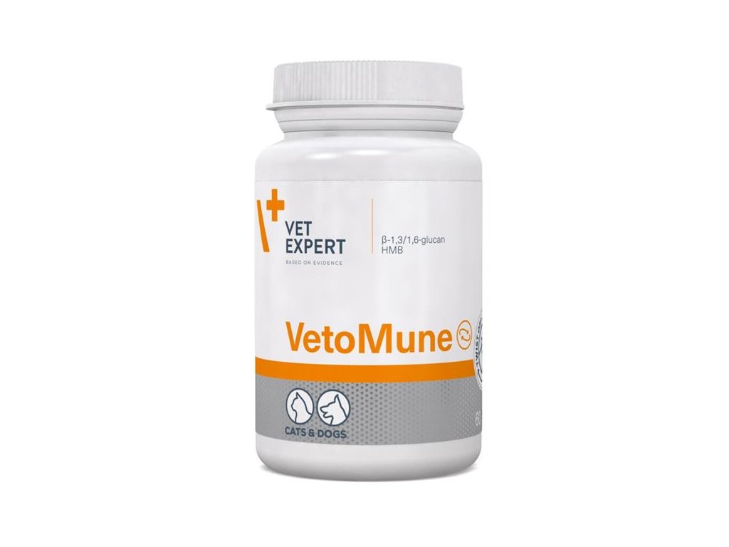 Jedinečný doplněk stravy VetoMune pro psy a kočky podporuje odolnost organismu dvojím působením: stimuluje buněčnou i humorální (látkovou) imunitu těla. Doporučuje se používat zejména v obdobích nebo situacích souvisejících se snížením imunity (stres, změna ročního období apod.). Podávání se doporučuje také u zvířat v rekonvalescenci a před očkováním.