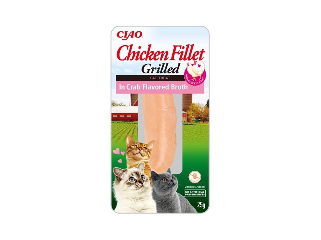 100% kuřecí filátko v poctivém krabím vývaru. Šťavnatý grilovaný filet z farmářského kuřete přináší díky neodolatelné chuti a vůni poctivého masa pravý gurmánský zážitek. Křehké masíčko potěší vaši kočku jako pamlsek nebo jako doplněk běžné krmné dávky. Lahodný vývar skvěle ochutí jakékoliv granule a pomůže zvýšit chuť k jídlu. Grain-free pochoutka s nízkým obsahem kalorií, bez obilovin, umělých barviv, chemických dochucovadel a aromat.