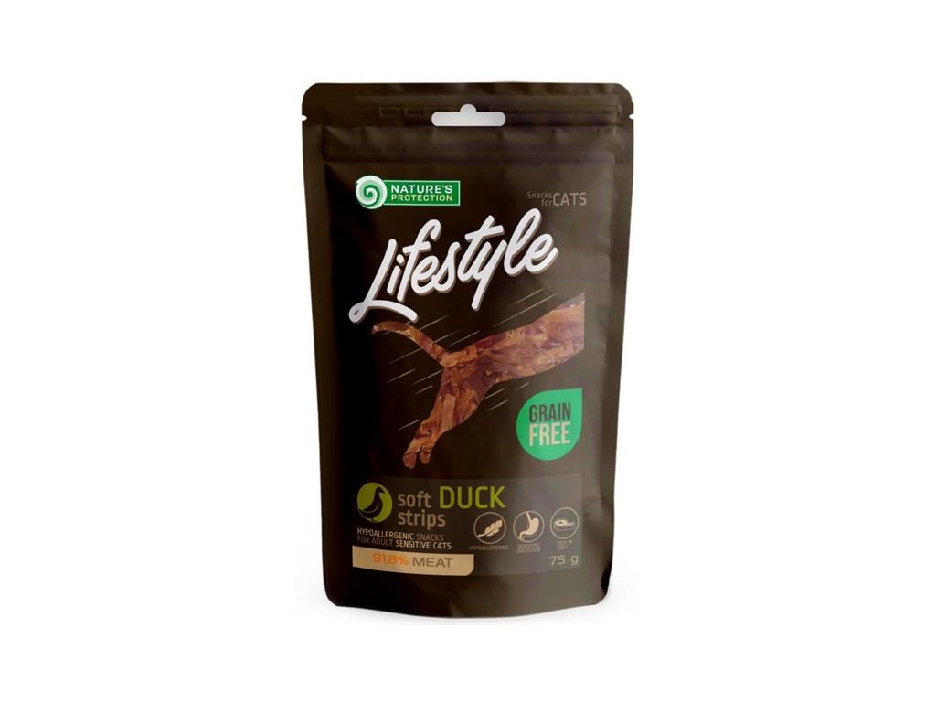 Doplňkové krmivo pro kočky Nature's Protection Lifestyle Cat Snack Soft Duck Strips – měkké kachní proužky.