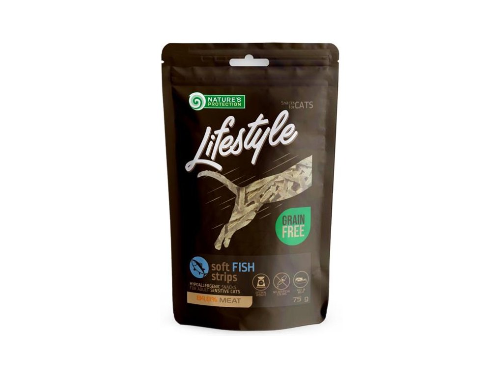 Doplňkové krmivo pro kočky Nature's Protection Lifestyle Cat Snack Soft Fish Strips – měkké rybí proužky.