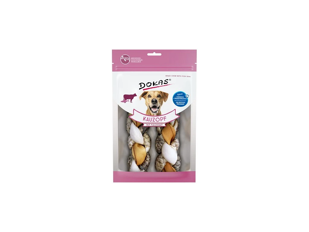 Neodolatelné copánky v kombinaci hovězí a rybí kůže zaujmou na první pohled. Skvělá netradiční pochoutka pro zabavení vašeho pejska. Žvýkání pomáhá udržovat zdravé zuby a dásně. Jsou velmi oblíbené pro své přírodní složení.Pamlsky Dokas jsou bez konzervantů, umělých barviv, dochucovadel a glycerinu. Sáček má praktické uzavírání, pamlsky tak zůstanou déle čerstvé a voňavé.