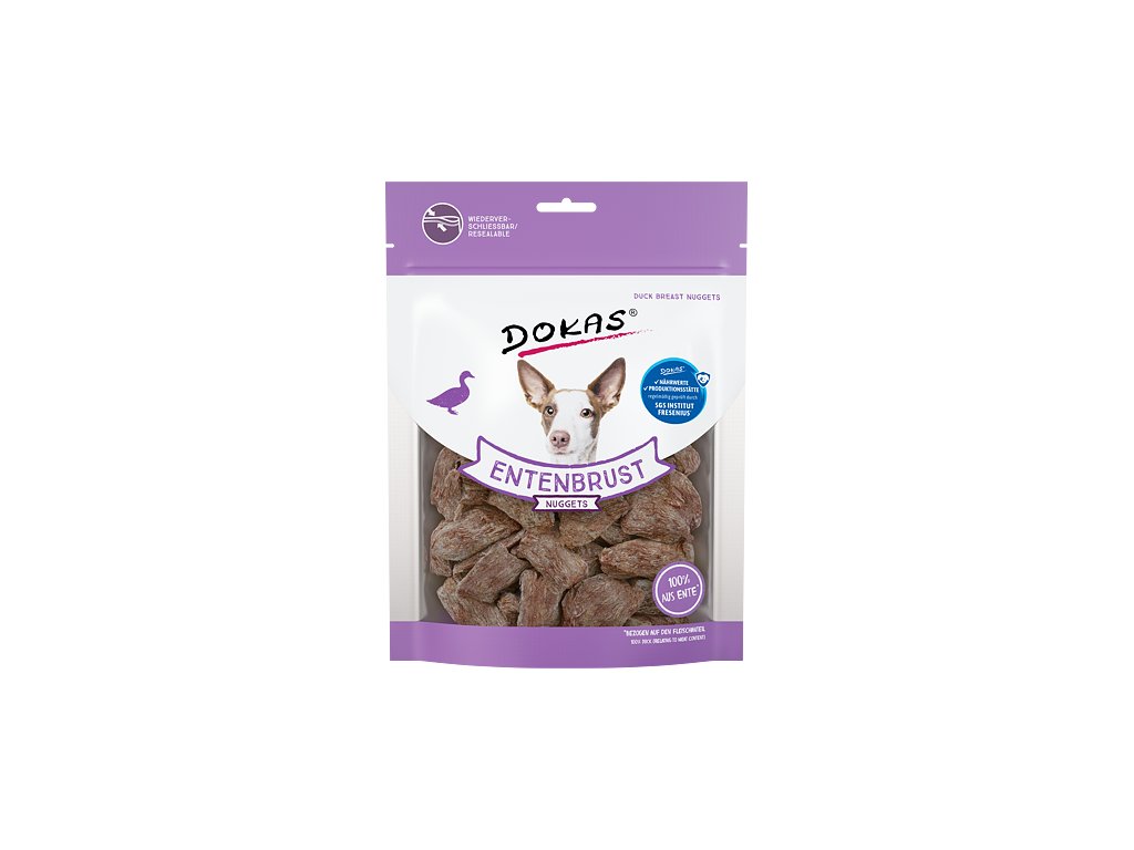 Nugety z kachních prsou sušené mrazem vynikají intenzivní chutí a maximálním zachováním živin díky šetrnému zpracování. Záruka skvělého mlsání i pro ty nejnáročnější. Vysoká kvalita použitých surovin zaručuje výraznou chuť a vůni. Jsou velmi oblíbené pro své přírodní složení.Pamlsky Dokas jsou bez konzervantů, umělých barviv, dochucovadel a glycerinu. Sáček má praktické uzavírání, pamlsky tak zůstanou déle čerstvé a voňavé.