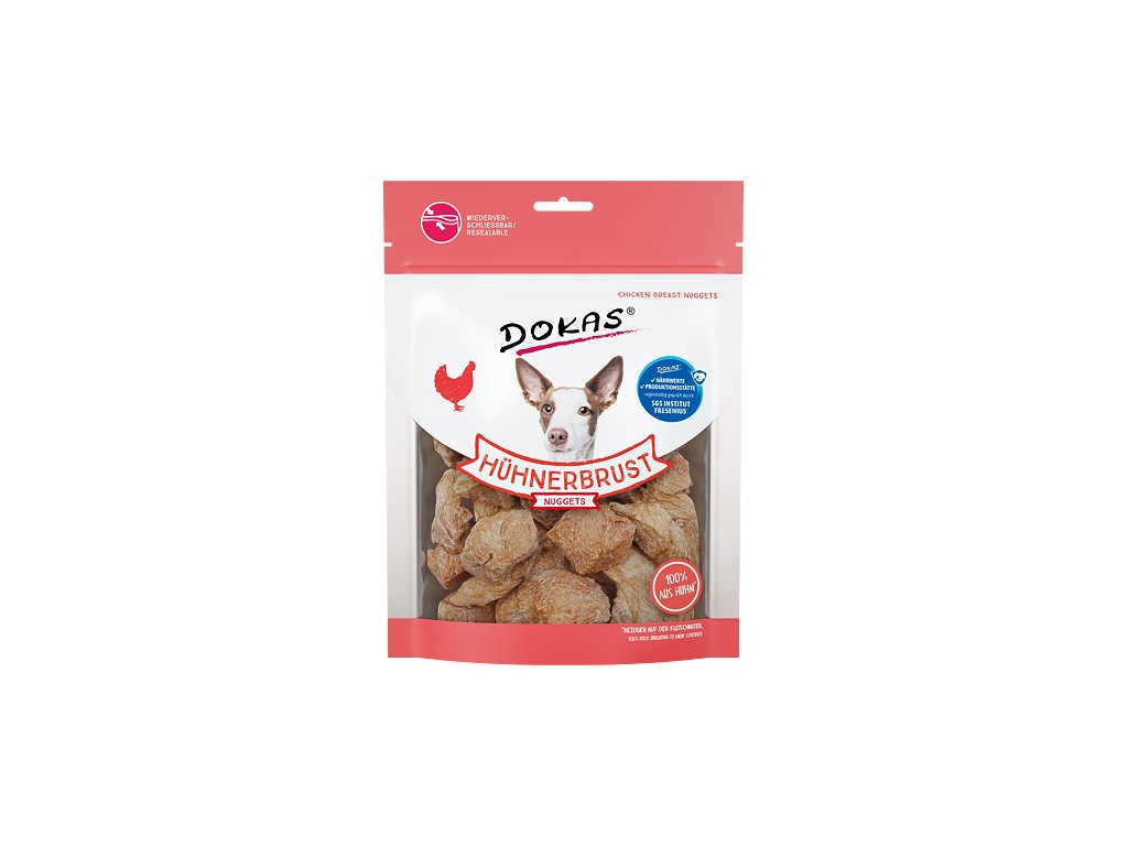 Nugety z kuřecích prsou sušené mrazem vynikají intenzivní chutí a maximálním zachováním živin díky šetrnému zpracování. Záruka skvělého mlsání i pro ty nejnáročnější. Vysoká kvalita použitých surovin zaručuje výraznou chuť a vůni. Jsou velmi oblíbené pro své přírodní složení. Pamlsky Dokas jsou bez konzervantů, umělých barviv, dochucovadel a glycerinu. Sáček má praktické uzavírání, pamlsky tak zůstanou déle čerstvé a voňavé. Složení: filet z kuřecích prsou 97%, vedlejší rostlinné produkty, kvasnice, kuřecí játra 0,4% Analýza: hrubé bílkoviny 78,7%, hrubé oleje a tuky 6,9%, hrubé popeloviny 4,6%, hrubá vláknina 0,5%, vlhkost 11,8% Podávejte jako odměnu. Zajistěte dostatek pitné vody. Po otevření pečlivě uzavřete zipem a skladujte v suchu a chladu. Balení obsahuje kyslíkový absorbér pro uchování kvality výrobku. Pamlsky jsou v dnešní době nedílnou součástí krmení mazlíčků, a tak i u nich je potřeba dbát nejen na chuť, ale i na zdravé složení. U pamlsků Dokas máte jistotu, že všechny použité suroviny splňují přísná kritéria a jsou během výroby pravidelně prověřovány. Psí a kočičí pamlsky Dokas podléhají pravidelným kontrolám kvality světově uznávaným německým institutem SGS Institut Fresenius. Tato nezávislá laboratoř patří mezi přední evropské společnosti testující kvalitu potravin. Jaké suroviny najdete ve složení pamlsků Dokas? Maso Maso je jednou z hlavních složek psí a kočičí potravy. Z toho důvodu tvoří největší podíl také v našich pamlscích. Je pečlivě vybíráno a šetrně zpracováno tak, aby výsledný produkt obsahoval vysoce kvalitní bílkoviny a tuky. Ryby Ryby jsou výbornou alternativou k masovým pamlskům. Obsahují vysoké procento nenasycených mastných kyselin. Omega 3 mastné kyseliny pomáhají udržovat zdravou kůži a lesklou srst. Ovoce a zelenina Vitamíny a stopové prvky v ovoci a zelenině jsou zdravé nejen pro lidi, ale také pro naše čtyřnohé přátele. Rádi kombinujeme maso a ryby s vybranými lehce stravitelnými druhy, jako je jablko, banán, mango, mrkev a batát. Hovězí a vepřová kůže Kosti vyrobené hovězí a vepřové kůže pomáhají pečovat o zuby vašeho psa a také jej umí perfektně zabavit. Kombinujeme je s masem či rybí kůží, což zvyšuje jejich oblíbenost. Díky těmto žvýkacím pamlskům nebude mít váš pes potřebu kousat vaše boty či zařízení bytu. Sůl Psi potřebují sůl zejména pro tvorbu kyseliny chlorovodíkové v jejich žaludku a k udržení správné funkce nervové soustavy. Její nadbytek však není žádoucí, proto přidáváme do našich pamlsků pouze malé množství, méně jak 0,3%. Kvasnice Kvasnice obsahují vysoký obsah proteinu, vitamínů a minerálů. Pomáhají udržovat zdravou kůži a srst. Rostlinné produkty Získáváme je při zpracování rostlinných surovin, například zeleniny a luštěnin. Nepoužíváme žádné odpady z rostlinné výroby a plnidla. Minerální látky Minerální látky jsou nezbytnou součástí výživy psa, jehož organismus si je nedokáže sám vyrobit. Používáme pouze malé množství soli (méně než 0,3%).Doplňkové parametry