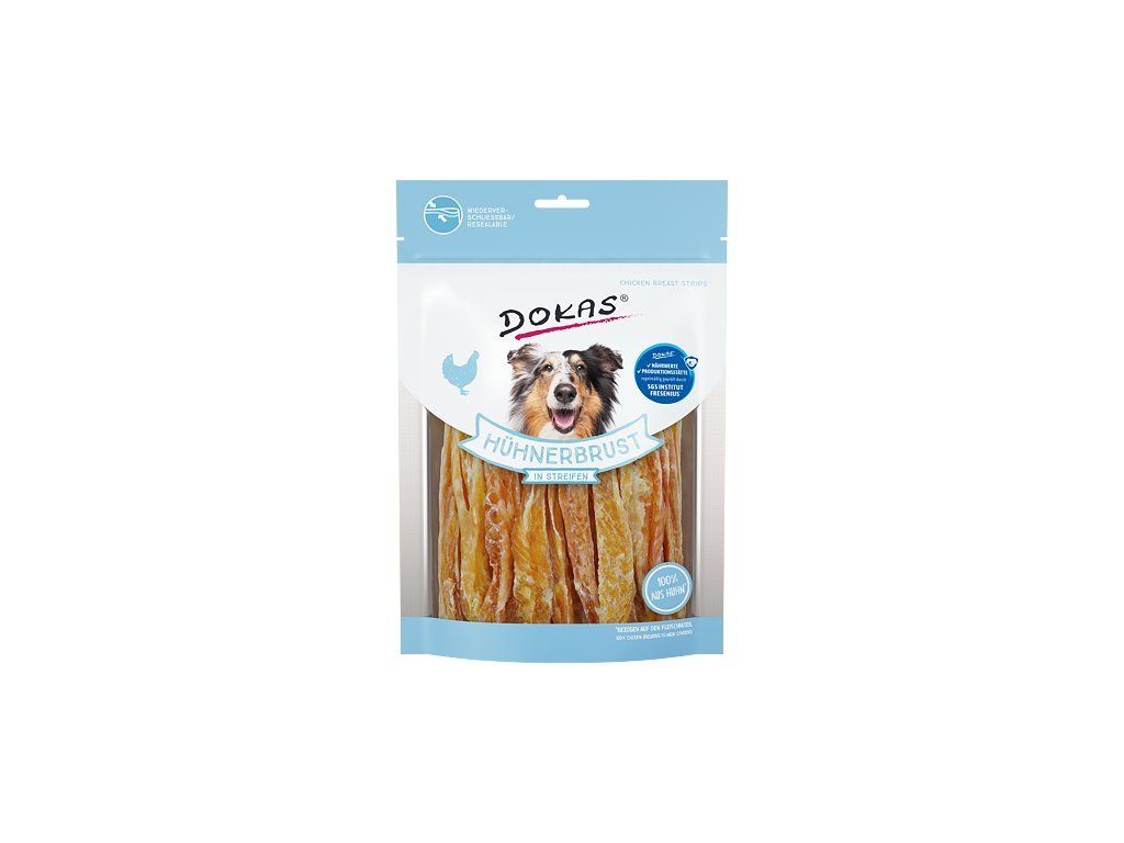 Lahodné kuřecí masové proužky jsou tradičně oblíbenou pochoutkou. Vysoká kvalita použitých surovin zaručuje výraznou chuť a vůni. Jsou velmi oblíbené pro své přírodní složení.Pamlsky Dokas jsou bez konzervantů, umělých barviv, dochucovadel a glycerinu. Sáček má praktické uzavírání, pamlsky tak zůstanou déle čerstvé a voňavé.