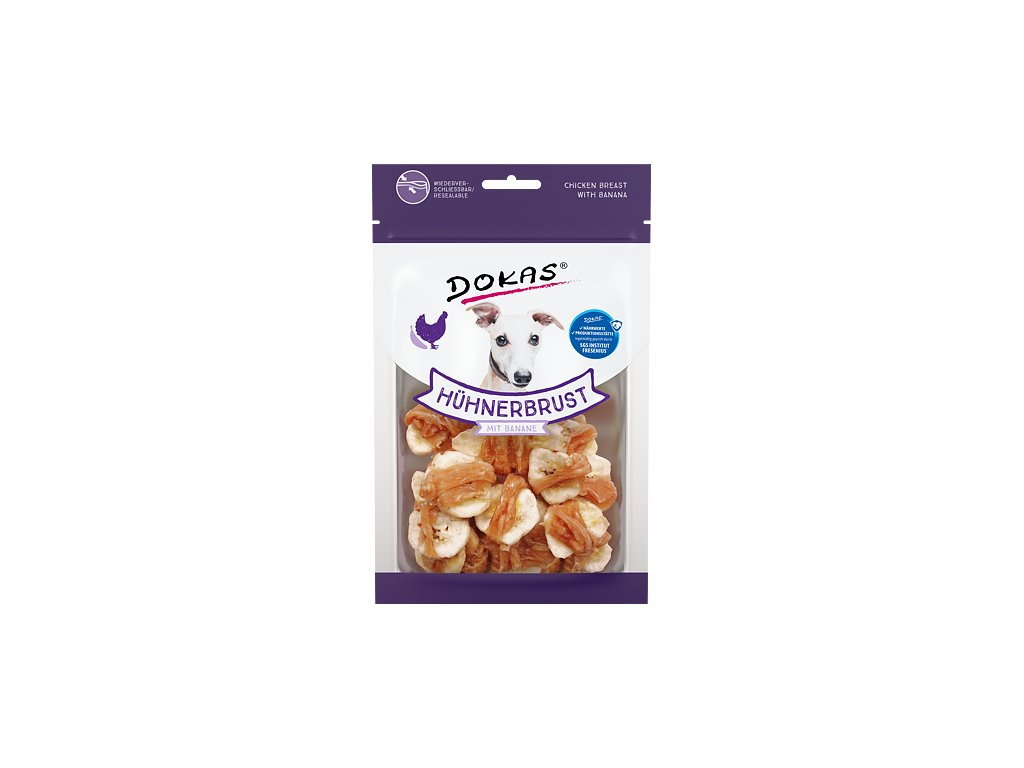 Zdravá kombinace sušených kuřecích prsou a banánů plná živin. Ideální pro milovníky dobrého masa a sušeného ovoce. Vysoká kvalita použitých surovin zaručuje výraznou chuť a vůni. Jsou velmi oblíbené pro své přírodní složení.Pamlsky Dokas jsou bez konzervantů, umělých barviv, dochucovadel a glycerinu. Sáček má praktické uzavírání, pamlsky tak zůstanou déle čerstvé a voňavé.