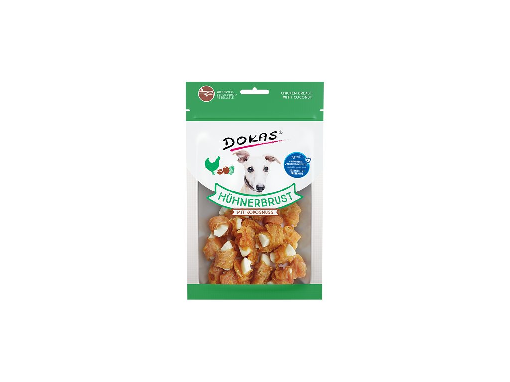 Pamlsky Dokas jsou bez konzervantů, umělých barviv, dochucovadel a glycerinu. Sáček má praktické uzavírání, pamlsky tak zůstanou déle čerstvé a voňavé.