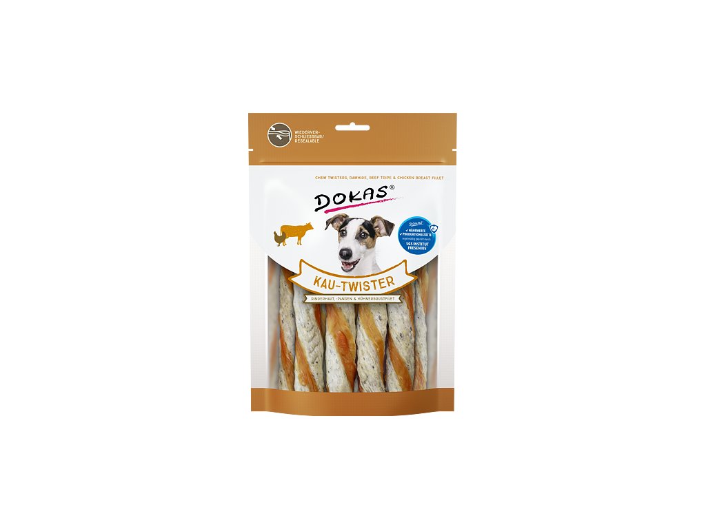 Kroucené tyčky z hovězí kůže s dršťkami a kuřecím masem. Jejich žvýkání pomáhá udržovat zdravé zuby a dásně. Vysoká kvalita použitých surovin zaručuje výraznou chuť a vůni. Jsou velmi oblíbené pro své přírodní složení.Pamlsky Dokas jsou bez konzervantů, umělých barviv, dochucovadel a glycerinu. Sáček má praktické uzavírání, pamlsky tak zůstanou déle čerstvé a voňavé.