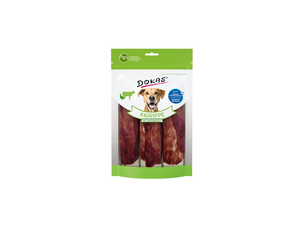 Žvýkací kosti z hovězí kůže ve tvaru žebírek jsou pro ještě větší požitek obaleny masem z kachních prsou. Žvýkání pomáhá udržovat zdravé zuby a dásně. Vysoká kvalita použitých surovin zaručuje výraznou chuť a vůni. Jsou velmi oblíbené pro své přírodní složení.Pamlsky Dokas jsou bez konzervantů, umělých barviv, dochucovadel a glycerinu. Sáček má praktické uzavírání, pamlsky tak zůstanou déle čerstvé a voňavé.