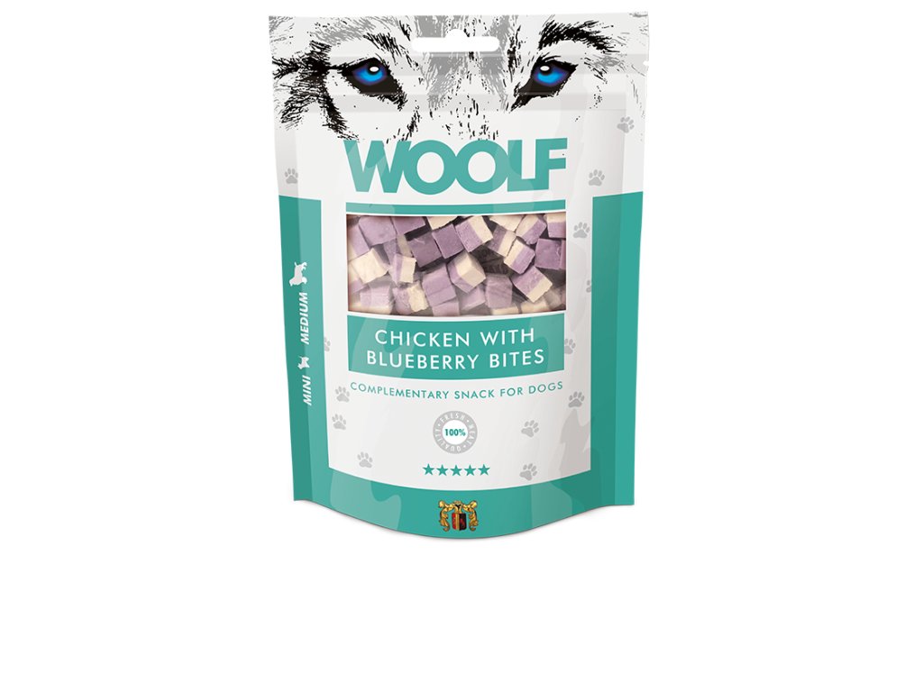 Kousky z kuřecího masa s borůvkami jsou vhodné pro malá plemena psů, obsahují mimo 70% masa také 20% borůvek, velmi kvalitního zdroje antioxidantů na podporu obranyschopnosti organismu. Pochoutky Woolfsnacks jsou speciálně navrženy pro psy všech plemen. Při výrobě jsou ze 100% použity suroviny té nejvyšší kvality pro co nejlepší příjem potravy. Veškeré pochoutky Woolfsnacks, jakmile se vyrobí, jsou zabaleny bez chemických přísad, konzervačních látek, nebo barviv. K zajištění ochrany je do sáčku umístěn absorbér kyslíku.